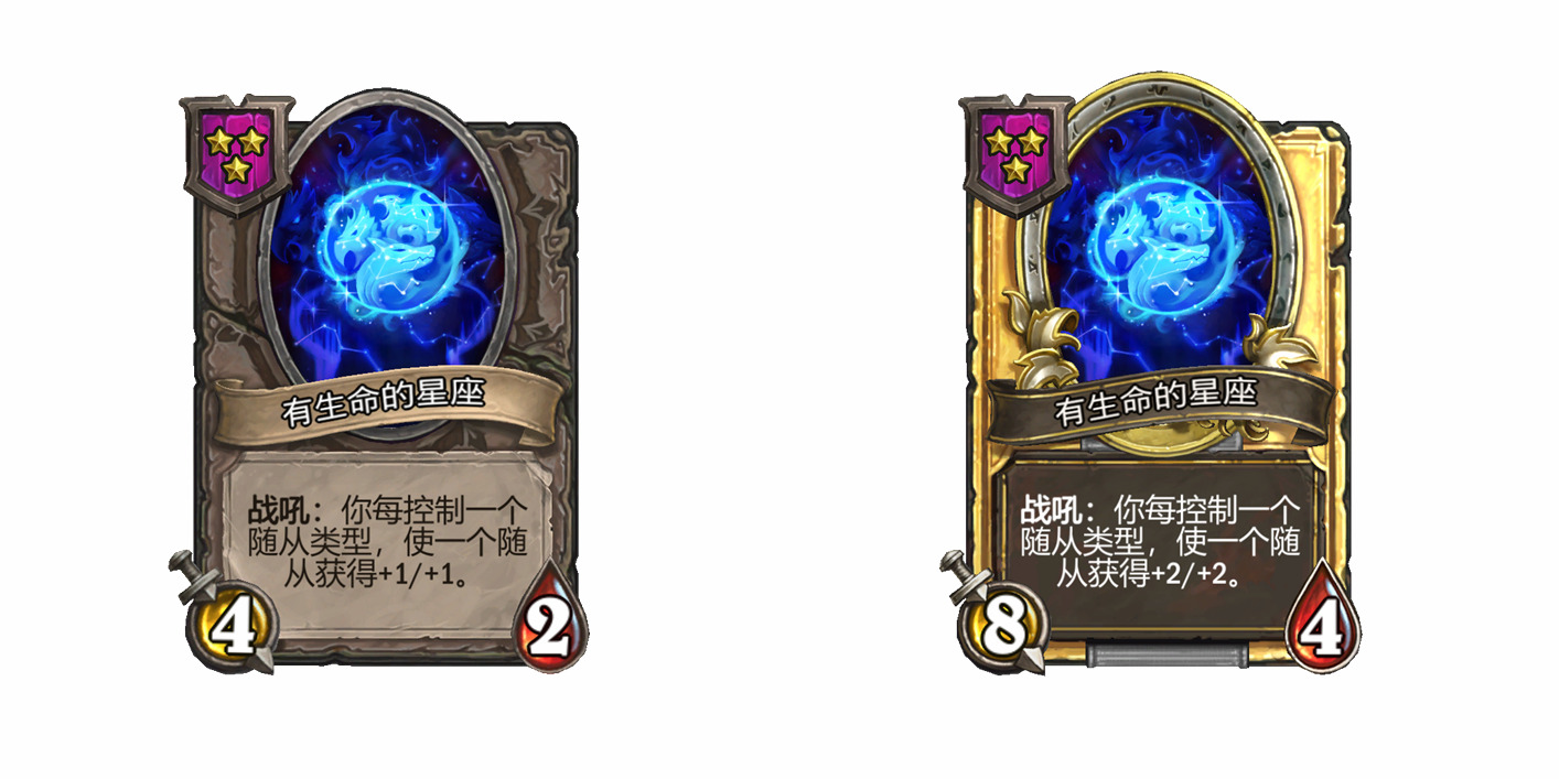 - 3星4/2,战吼:你每控制一个随从类型,使一个随从获得+1/+1