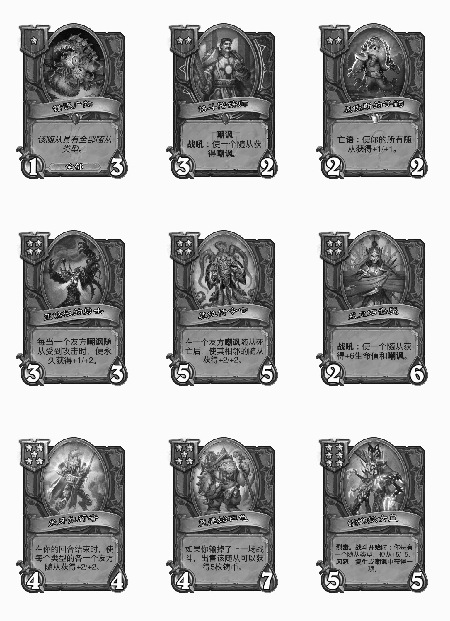 27.2战棋预览季的第一波预览由主播Rdu发布,包含中立及一半种族的随从池变化情况。中立方面,较多重做集中在嘲讽一族。光牙终于滚粗了!