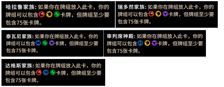 家族(三色卡组):本游戏中双色称为“职业”,三色则称为“家族”,理论上三色共有10种组合,本次新版本提供了其中5种组合。分别是红黄绿(哈拉鲁家族)、红黄紫(瑞多然家族)、蓝绿紫(泰瓦尼家族)、蓝黄紫(审判席神殿)、红蓝绿(达格斯家族)。