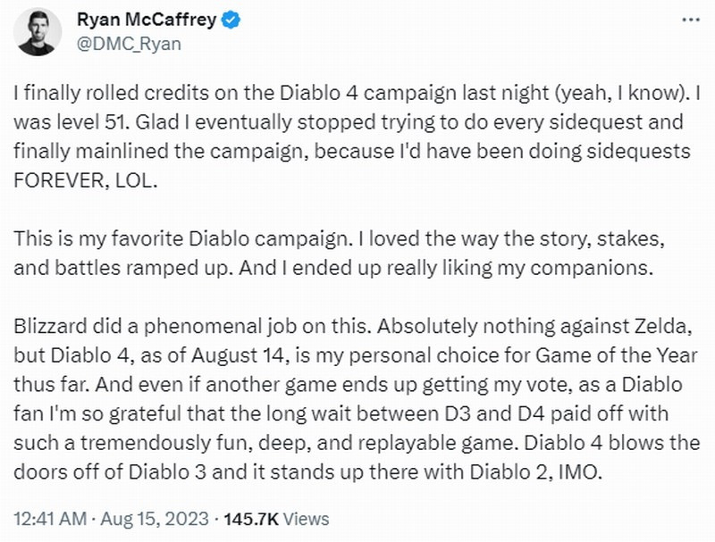 外媒IGN编辑Ryan McCaffrey发推文称自己于8月14日升到51级,终于通关《暗黑破坏神4》,这是他最喜爱的《暗黑》战役。他认为《暗黑4》是其心目中的年度最佳游戏。他表示:“虽然从《暗黑3》到《暗黑4》的等待如此漫长,但很开心能体验到这样一样很有趣、有深度且能重复体验的游戏作品。我认为《暗黑4》比《暗黑3》优秀,并与《暗黑2》并驾其驱。”