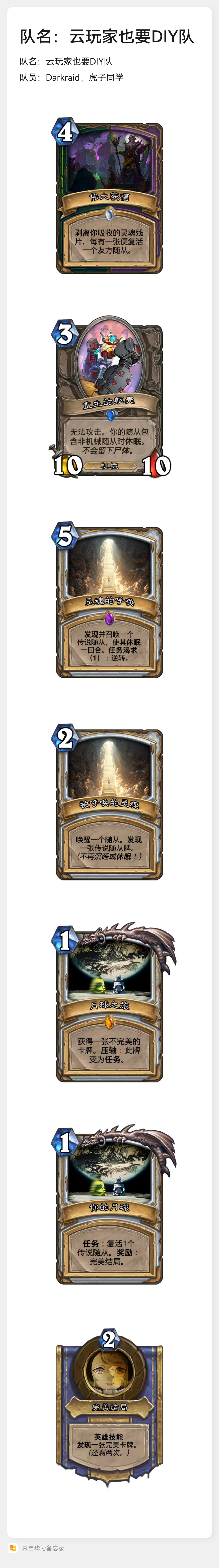讲故事的系列卡牌,私以为应该做到以下几点:一,讲述的故事应在易读性与新颖性之间平衡,无论是理解不能还是平平无奇都是要在故事分上失分的。这个故事我反正是看得一知半解。月球之旅不知道是不是碰瓷某已有故事。二,作为炉石卡牌本身,具备基本的游戏性,机制的合理性与风味描述不应过多让位于故事性。重生的躯壳和“任务渴求”有些生硬,月球之旅1费压轴毫无难度,作为伪任务不能起手上手则很难受。三,在讲故事的同时,卡牌机制与风味上的协调性也应以协调为佳,四张巧妙关联的卡牌观感必然胜过体系上完全孤立的卡牌。在故事性不出彩的情况下更是如此。重生的躯壳一卡如果重做为传说随从(比单纯的稀有度递增更好),灵魂的呼唤如果加入复活效果,都会增加协调度。