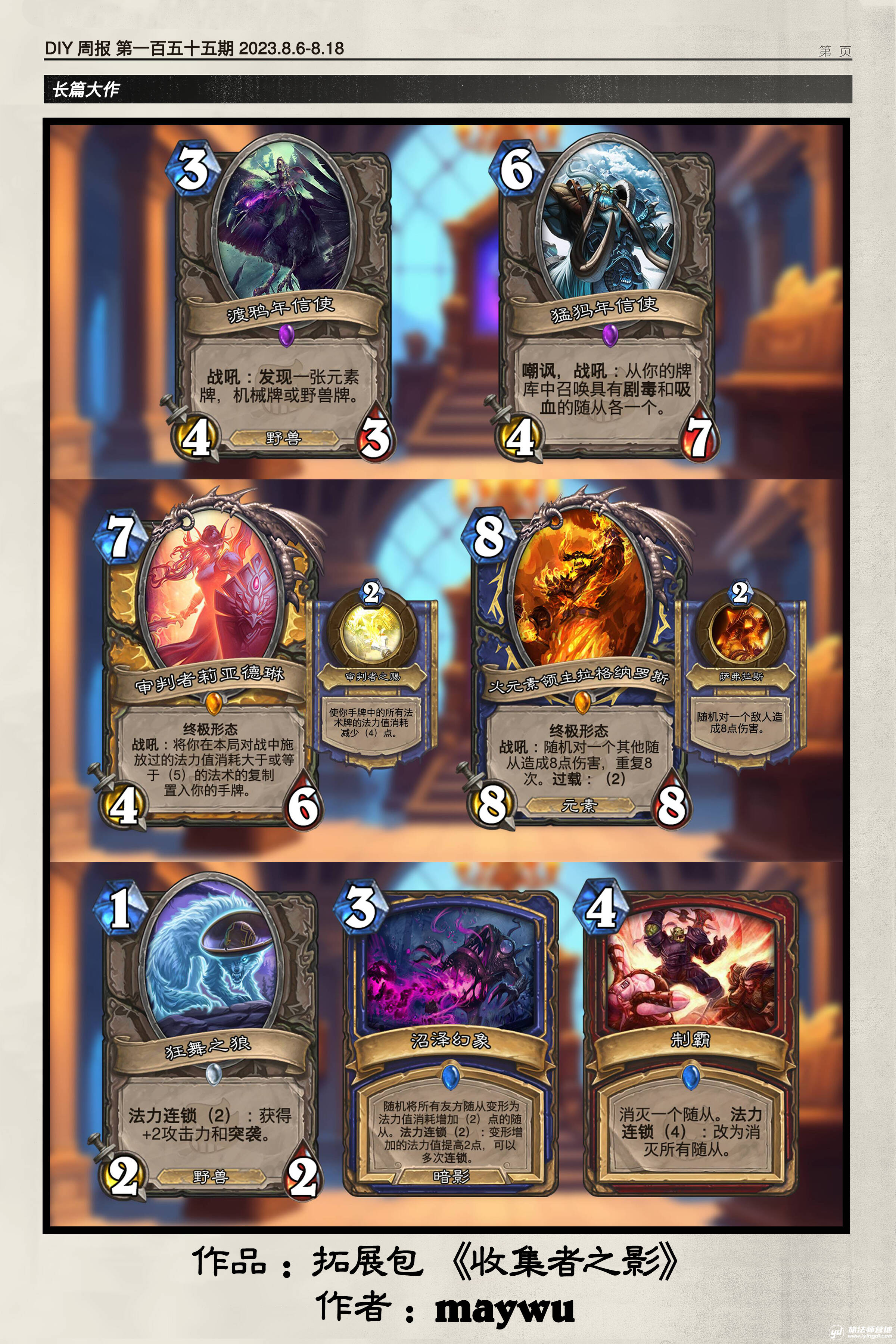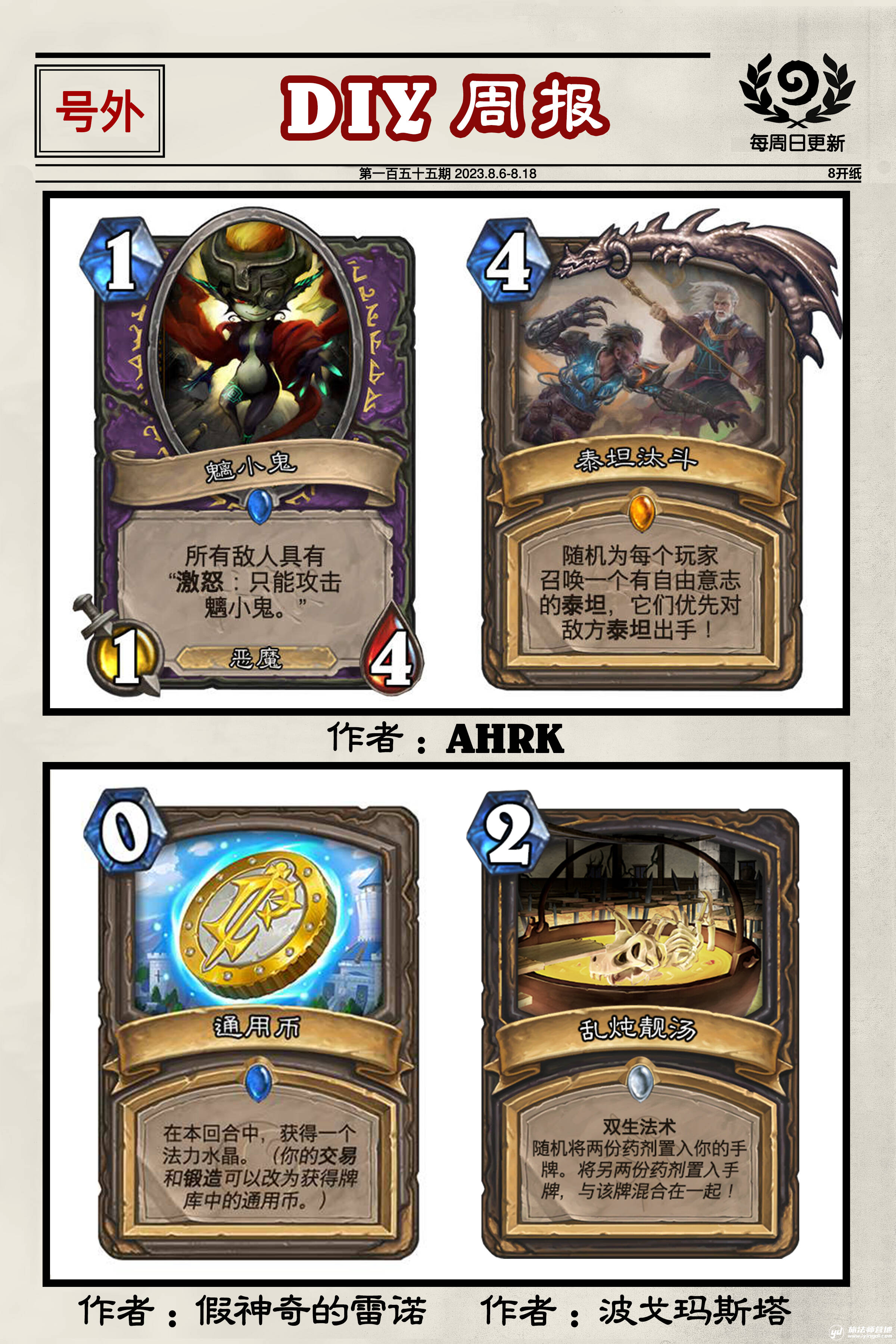 不得不说选手相当会耍小聪明,用蓝贴的方式暗示了本系列卡牌与该队伍本次锦标赛投稿的关联,突出一个自我指涉的元性。奥秘泰坦也是颇有意思的尝试,在环境中只有这一个奥秘泰坦的情况下,对手还可以有意识地与使用方进行博弈。回归初心0费压轴风怒有点离谱。