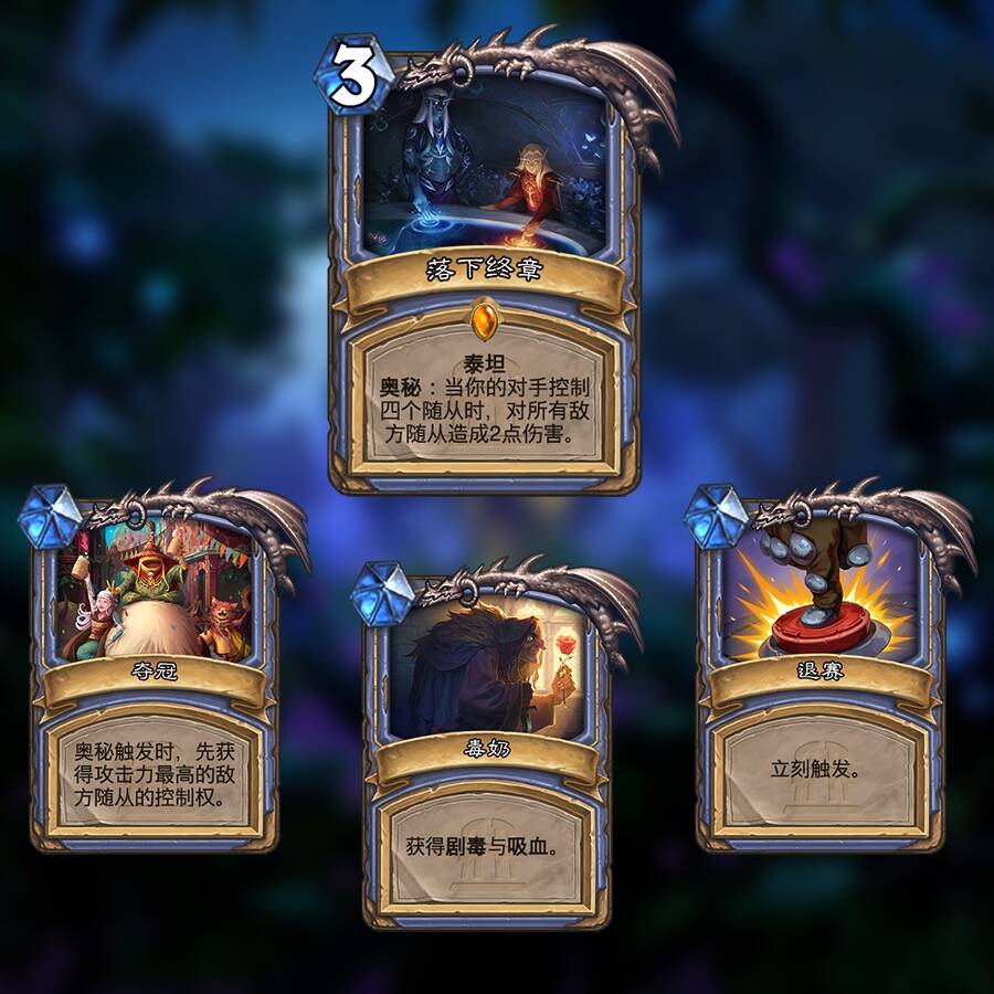 “回归初心”漏了锻造旗帜。“大战开启”10费且没有为你的随从提供护脸/解场手段,多半会在下回合被对面平推。泰坦奥秘的3效果使得其可以作为一张2回合启动的单方向清场牌或单解牌。相比夺取控制权,更建议“在触发后消灭存活随从中攻击力最高的”之类的效果限制强度。此外,条件“对手控制4个随从时”代表使用时如果对手已经有4+随从,那么会立刻触发或者在对手回合开始时立刻触发。如果是后者,作为3费法术来说有些太强了。