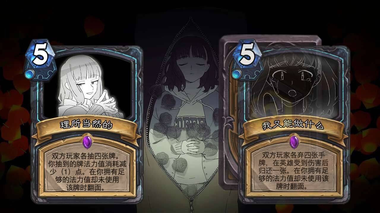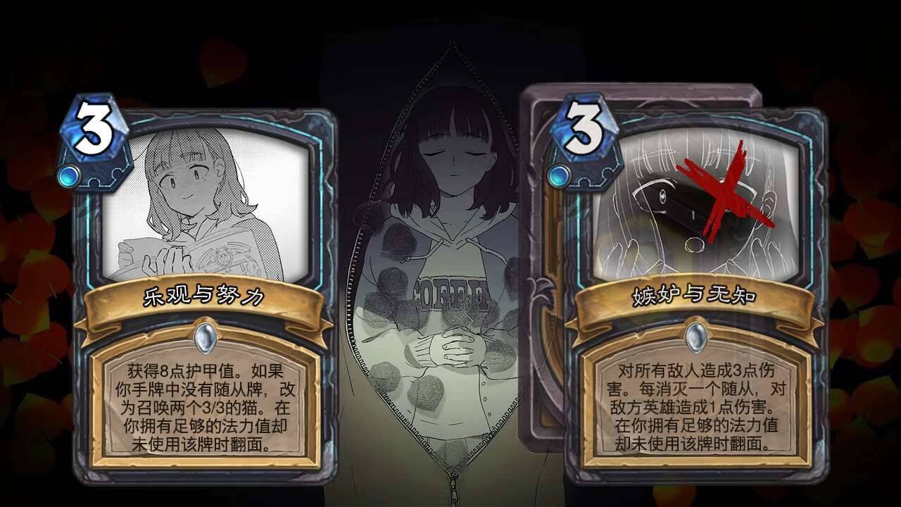 最意识流的故事。 只看后面三张牌的话是个精神异常的少女,但是第一张牌的骸骨又增添了一丝奇幻色彩,使得没法解读这个故事。后文的意识流内容也表达的太过晦涩。对于翻面的时机没有解释清楚,且每张牌正面反面都有双效果+转化的条件,乐观与努力的双效果又无联系,四张这种效果加剧了堆砌感。整体上四张牌是表达某种心情,而非故事。