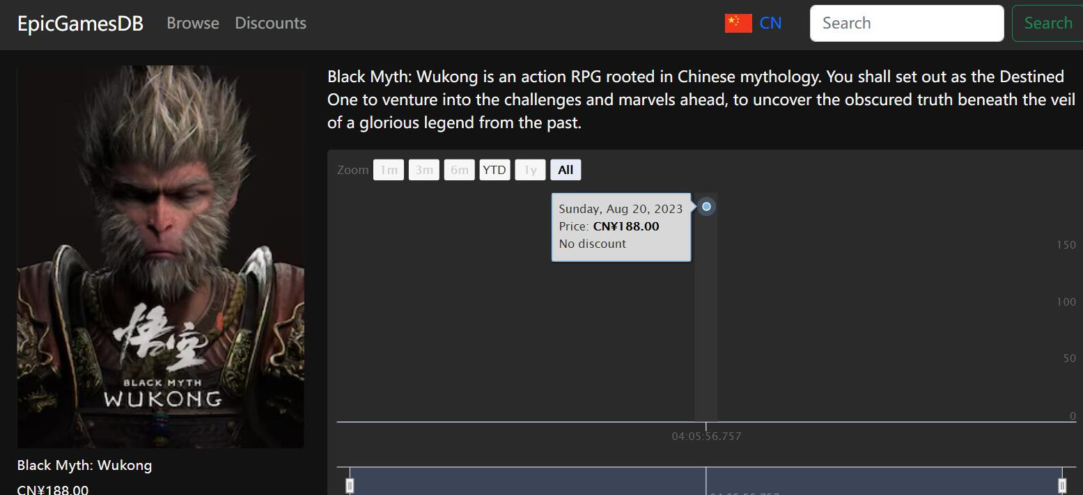 EpicGamesdb是类似Steamdb的第三方数据网站,可以查看Epic平台各游戏的历史折扣和各区域定价。目前Steamdb还未显示《黑神话》的定价,而EpicGamesdb已经显示出了它的定价。看起来《黑神话》跟许多3A游戏一样,选择了60美元的定价标准,不过对国区做了特殊处理。