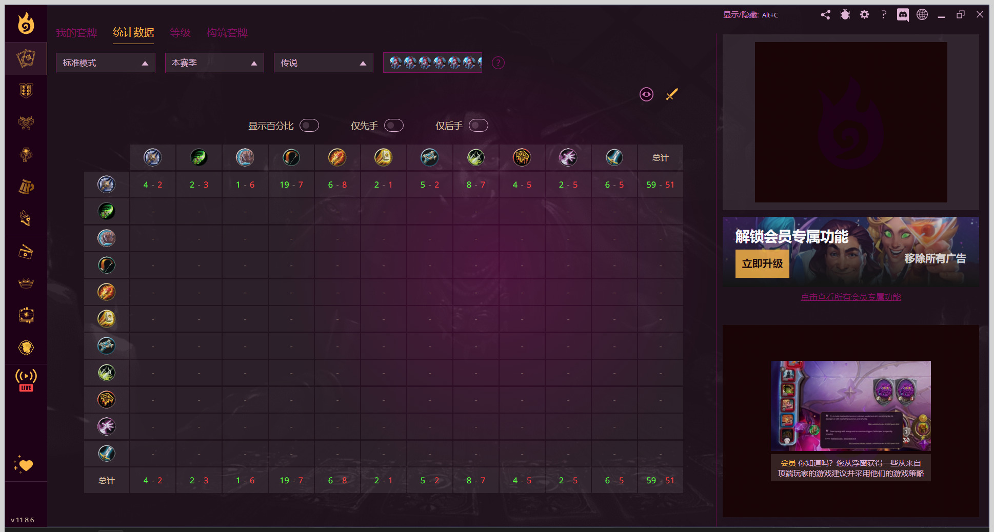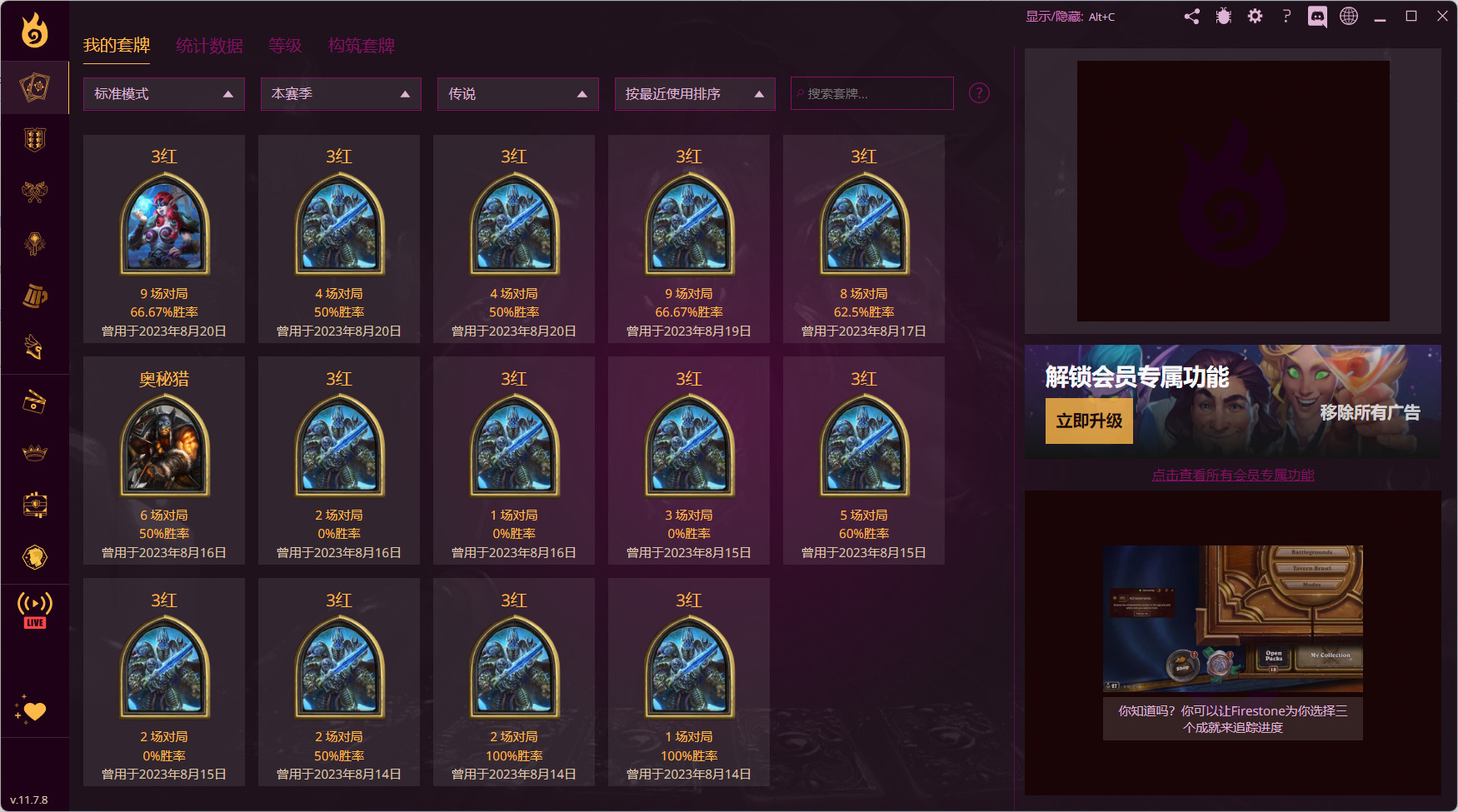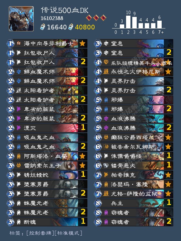 众所周知啊,快攻只是为了上传,真要体验炉石传说的快乐还得是我控制卡组!控制卡组的精髓是什么呢?既然是控制,那必然要带一把霜之哀伤对其他卡组知根知底,以下是我在欧服传说500-1000分段使用的血DK,记牌器是火石,因为微调很多次所以数据比较分散,话不多说,上图。
