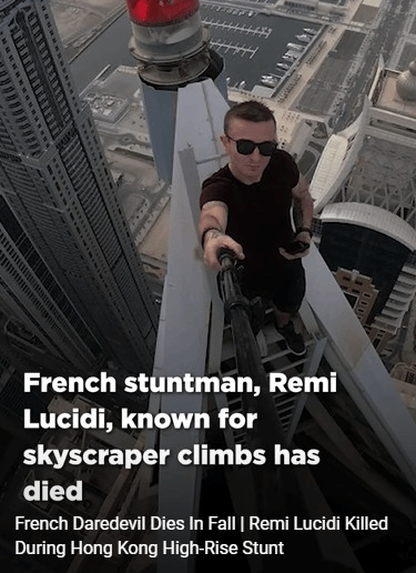 最后证实,这位男子正是30岁的雷米·卢西迪(Remi Lucidi),其去年曾登顶迪拜、保加利亚和法国的高层建筑,甚至还爬上了法国最高的烟囱,且在没有任何保护措施的情况下在300米高的烟囱边缘行走。