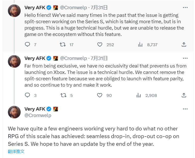 我们有不少工程师正在努力实现同等规模的其他RPG没有做过的事情:在Xbox Series S上实现无缝加入、退出合作。我们希望年底时能更新这一消息。”