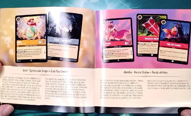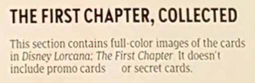 在最新透露出的礼盒手册中,手册展示了lorcana第一章的单卡图鉴,其中较为令人感兴趣的是手册中提到图鉴不包含P卡以及SECRET卡,根据推测secret cards将是补充包中编号外的高罕卡牌。