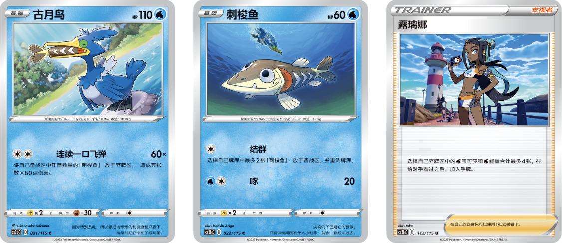 补充包【浓墨重彩 靛】中收录的古月鸟是一张非常有趣的卡牌,能通过将自己备战区里的刺梭鱼放于弃牌区来提升其招式【连续一口飞弹】的伤害。作为一只基础宝可梦,古月鸟只需2个无属性能量便能造成最高240点的夸张的伤害,利用【连续一口飞弹】在战场上“刺穿”一切吧!