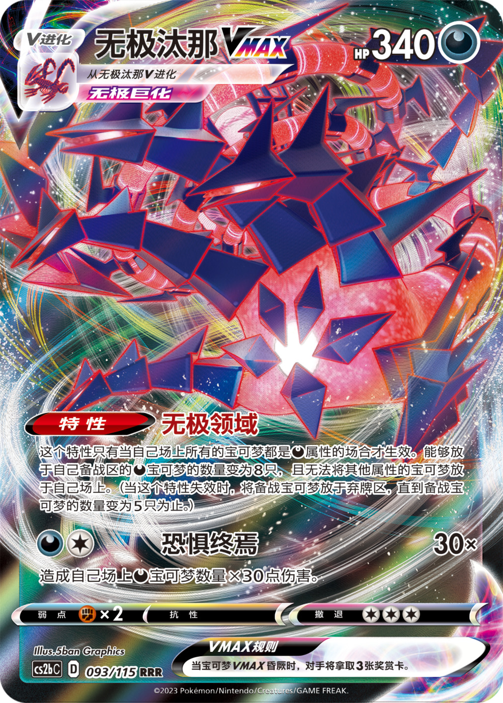 招式【恐惧终焉】能根据自己场上恶属性宝可梦的数量提升伤害,最高可造成30x9=270点伤害,而伤害如此高的招式居然仅需1个恶属性能量和一个无属性能量便能使用。前期尽可能在备战区放满8只宝可梦,再用【恐惧终焉】终结对手,充分发挥无极汰那VMAX的独特机制,构思一套属于你自己的常胜卡组吧。