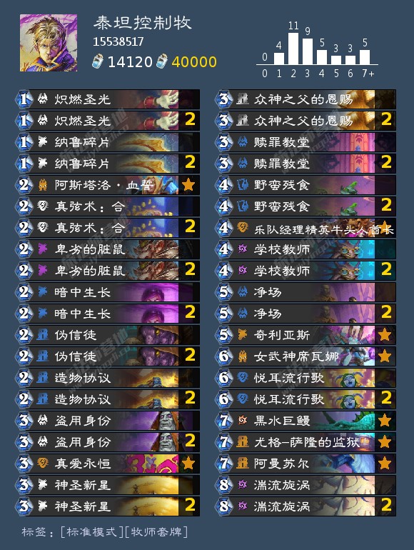 将奥丁战熬到弹尽粮绝,疫病dk用光每一张卡牌,法师失去过牌手段,术士和猎人的坟场空空如也。在泰坦的加入下,新版本控制牧同样拥有很强的控制手段,以及高回复手段,甚至拥有许多随机找传说的乐趣,减少了控制卡组的乏味。这就是新版本泰坦控制牧的潜力。由于新卡的加入,我们可以通过2费新卡找到三四个泰坦或三四个脏鼠,这都给了我们对战法师以及依赖坟场续航的猎人和术士一战的机会。而大量的群解和单解能让我们从容应对骑士和盗贼,这也一直是牧师的长处。它仍然存在需要改进的空间,现在环境中后期卡组居多,如何抵挡泰隆的身材翻倍是个很大的问题。目前猎人,dk,战士都有携带翻倍,翻倍打出后都拥有离谱的打脸手段,我们经常35血**。目前从青铜打到钻10,惊奇的只输一把术士,三把猎人,一把战士,两把法师,dk则是我们的上分饲料,快攻只输一把萨满,一把骑士。还是那句话版本初期,谨慎合卡,有上版本沉淀的小伙伴可以试一下,卡组需要一定熟练度和想象力去配合随机得到的传说卡牌。目前卡组的话应该是处于t2上游左右。