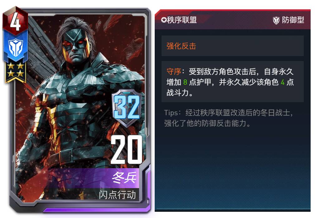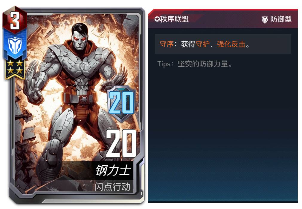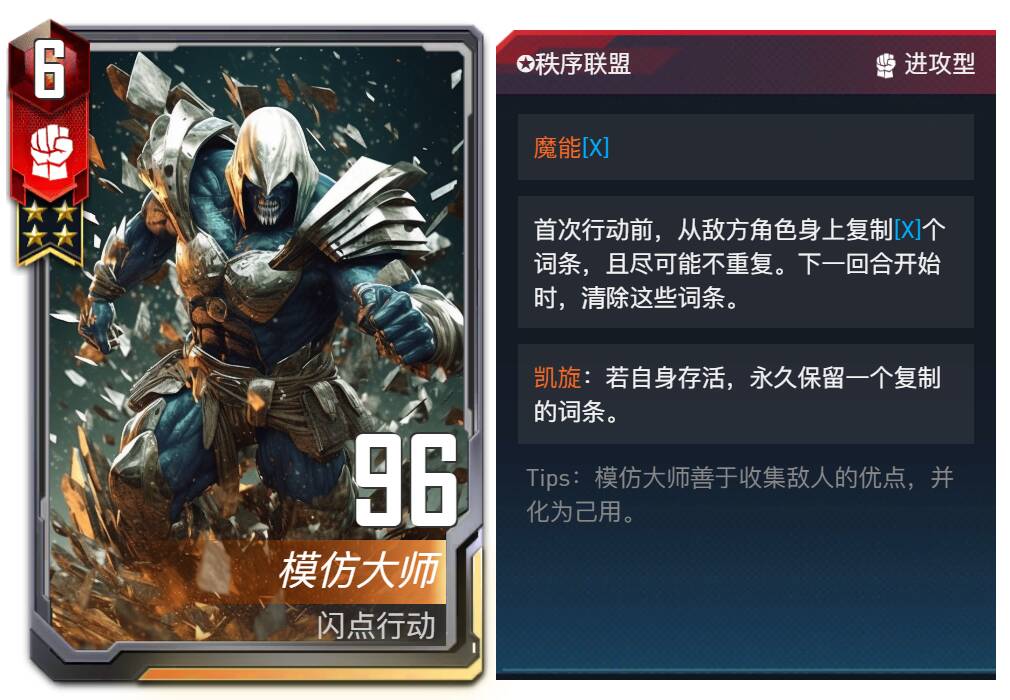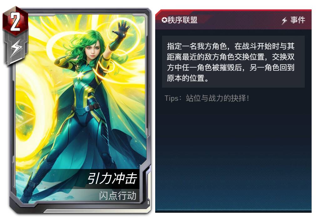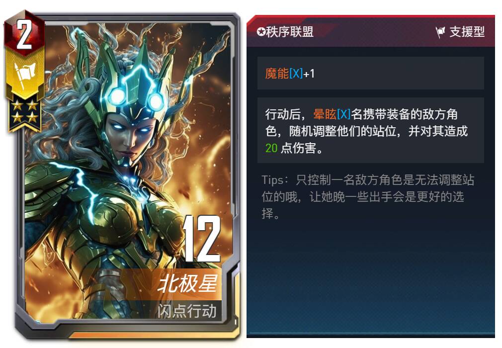 设计思路:在游戏中,我们有多种方式来限制站位,或者针对站位,但是却极少需要利用站位获得优势,这导致除了抢先手或躲避刺杀,在大多数情况下站位似乎并不能带来可观的收益,而仅能用于防止被对方针对。这使得大部分对局中的站位都是更加功利的,少了一些对优势的思考。因此,我们在设计秩序联盟这一阵营时,首选考虑的就是站位的问题,其中守序词条更看重固定下来的站位带来的长久优势,同时也限制了站位的变化并给了对方更多的针对可能性;而魔能词条则是更好的利用了站位带来的行动顺序的改变,在抢占先手和获得强化之间,玩家们需要更多的思考和观察,选择恰当的排序,发挥最大的功效。当然,在利用站位的时候,玩家也会因此遭到更多的针对,只有进行适当的改变才能让自己立于不败之地。