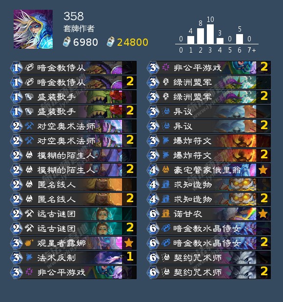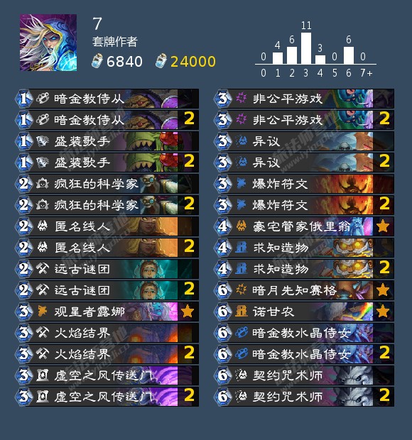 - 奥秘法(7,358)之前在狂野日报那边也看到有带过牌刀的奥秘法,只能说大家自行取舍,我的话除了露娜,赛格和刀都能接受,还有就是大家都不带调酒师带求知造物了,我个人感觉两个还是各有好处吧,不过看大家都不带调酒师还是比较惊讶的。