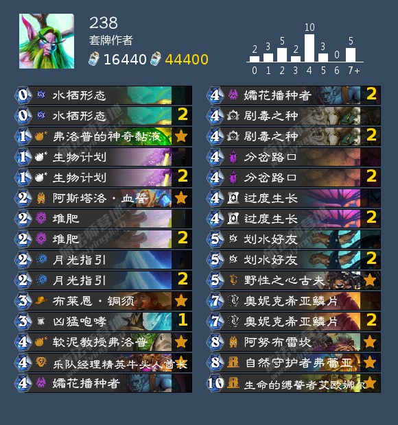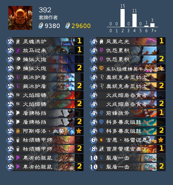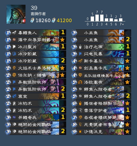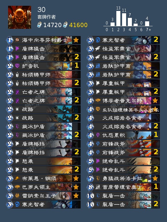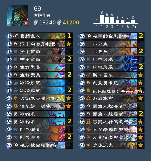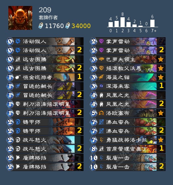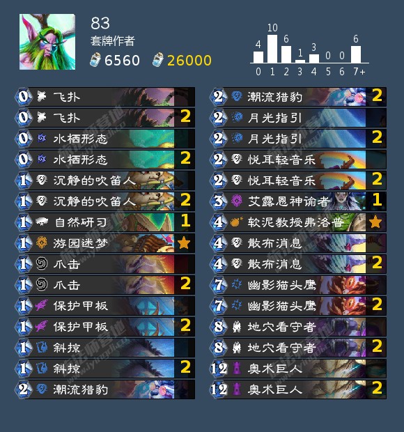 新卡包的上线对狂野来说还是有一定影响的,狂野过载萨冒出来一堆,我之前很不喜欢打德鲁伊,因为对奇迹德和口德留牌不一样,现在萨满有战吼萨偶数萨过载萨了,也可以掩护上分了。然后就是机械骑也多了不少,不过就我个人体感上其实补的几个低费机械只能算补强的强度,四费法术那张才是给机械骑带来的新的制胜手段,就算被萨满衰变了也还是可以一地杂毛加攻打死,不过我不喜欢带4费法术的构筑,令人感慨。任务瞎的构筑也得到了一些调整的空间,还有就是巨人术也得到了上场的机会,小光头也可以拿奥丁整花活(话说上个版本是不是也是拿托尼整花活,小光头的花活好多。)应该是八月四号那天我边上班边摸鱼打到了亚服传说79,钻五以下战吼萨,钻五以上机械骑。闲话就说这么多,大家看看卡组发表一下自己的意见吧。对卡组有疑问或想了解详细构筑的可以评论区问问,或者直接看网站Hearthstone TITANS Pro & Streamers Deck List Compilation (hearthstone-decks.net) ,同时以后应该也会以网站数据为主,个人理解为辅讲解搬运卡组,欢迎大家关注。 (搬运纯属个人行为,有疑问还请联系)