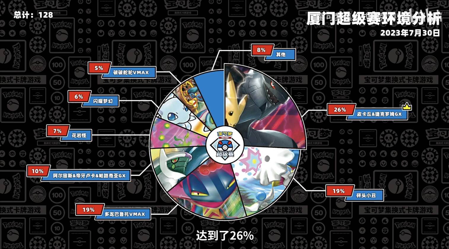 在公开组前128强中,“皮卡丘&捷克罗姆GX”卡组占比达到26%,在之前比赛中夺冠的“砰头小丑”卡组与在强化包“极巨攻防”中推出的“多龙巴鲁托VMAX”卡组也各有19%的占比。此外“阿尔宙斯&帝牙卢卡&帕路奇亚GX”卡组也非常稳定,有10%的训练家使用。