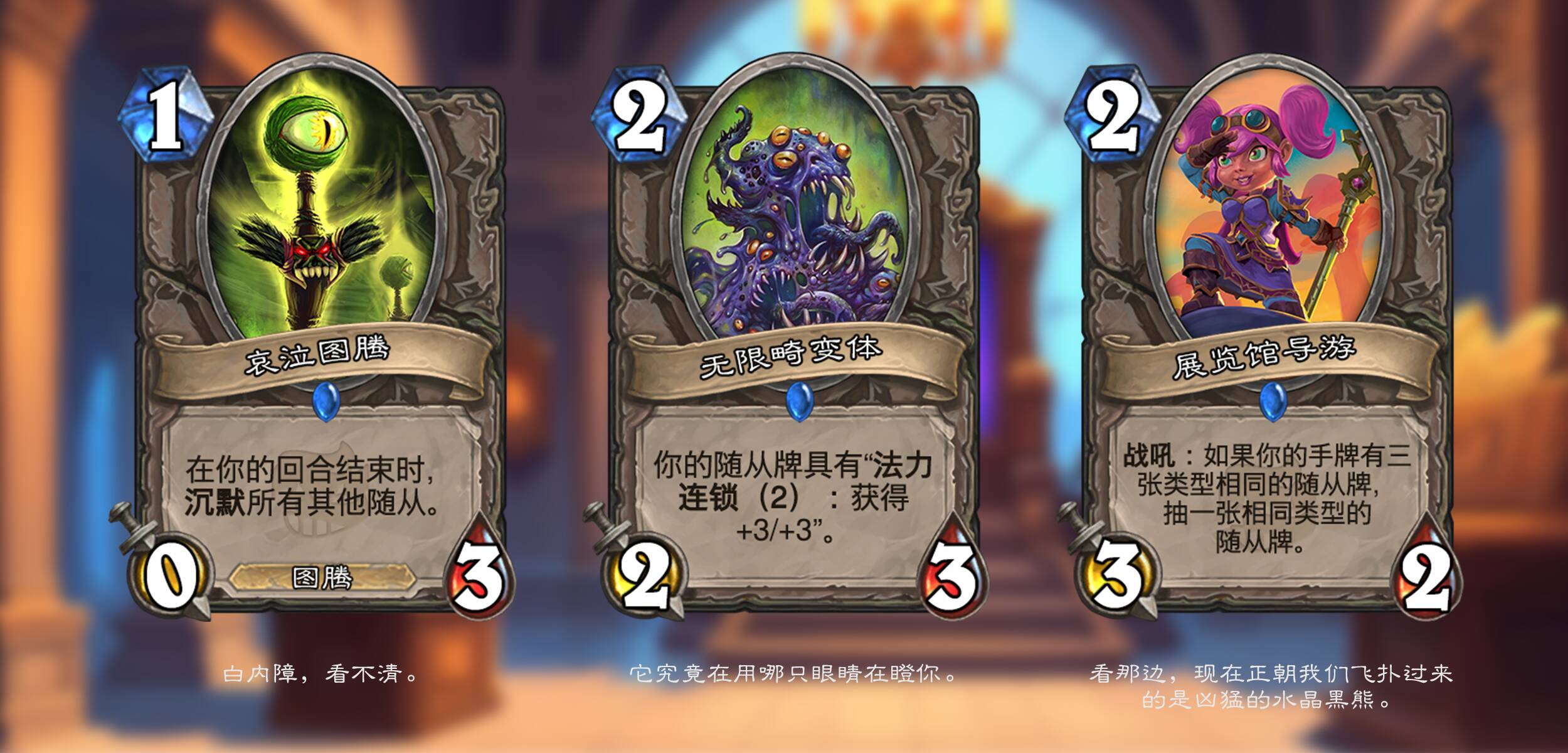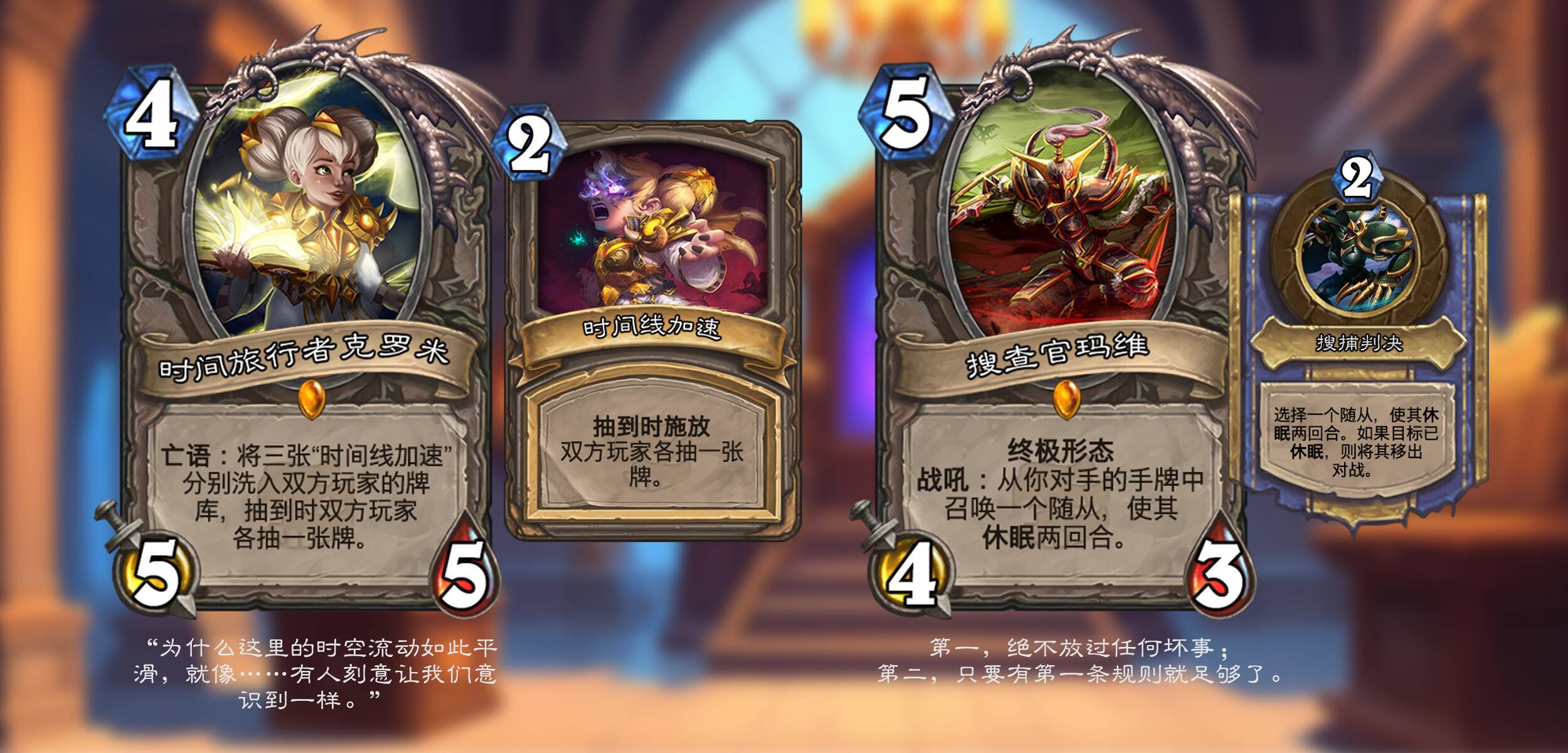 时空错乱得有序,就像有人拿针线将不同的命运串联在一起一样。在本次拓展包中,每个职业的英雄都会被传送到时间线上的一个任意的地点,并且获得一个与自己不那么搭的(也许)随从类型相关的新体系。在这些时空中发生的故事似乎也发生了意想不到的变化……