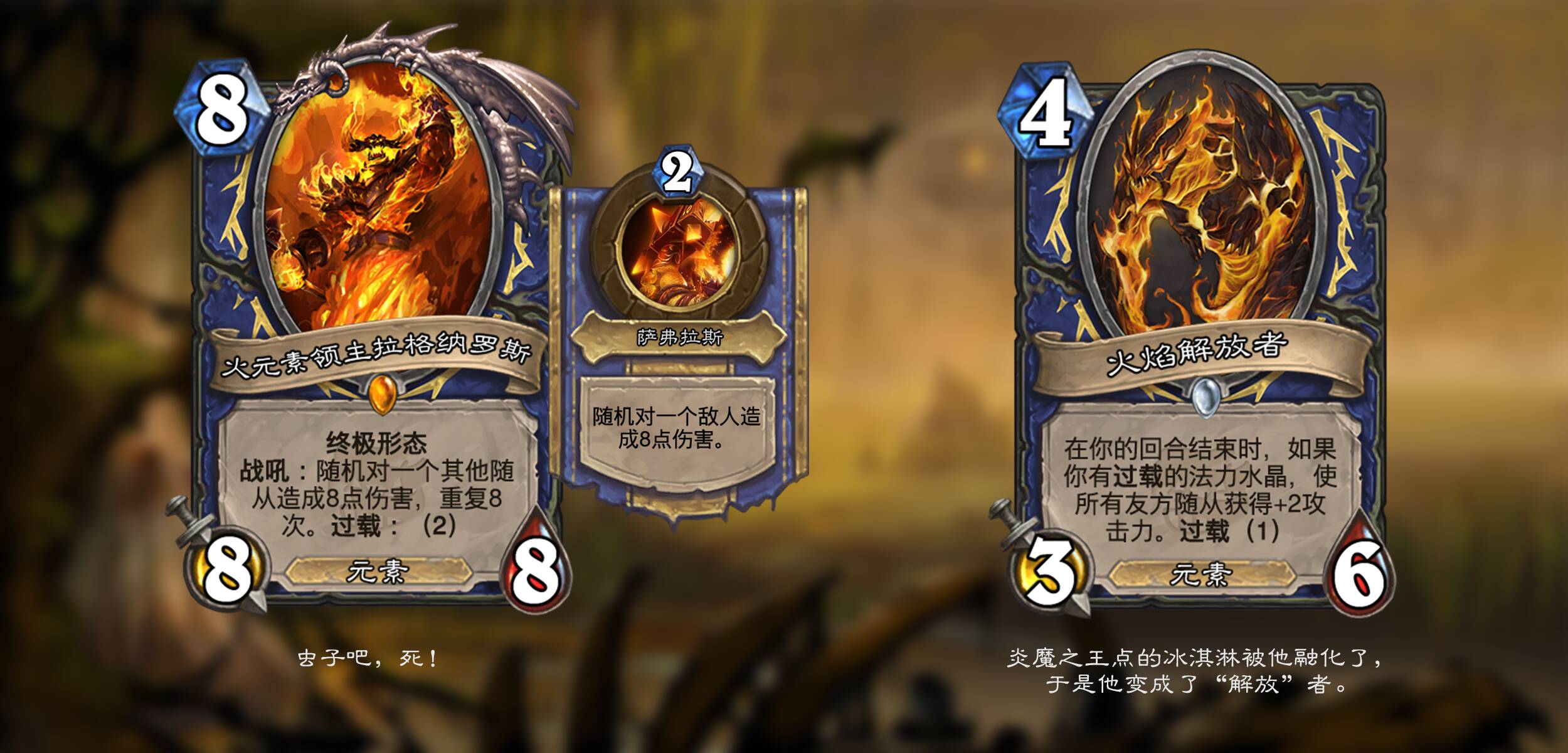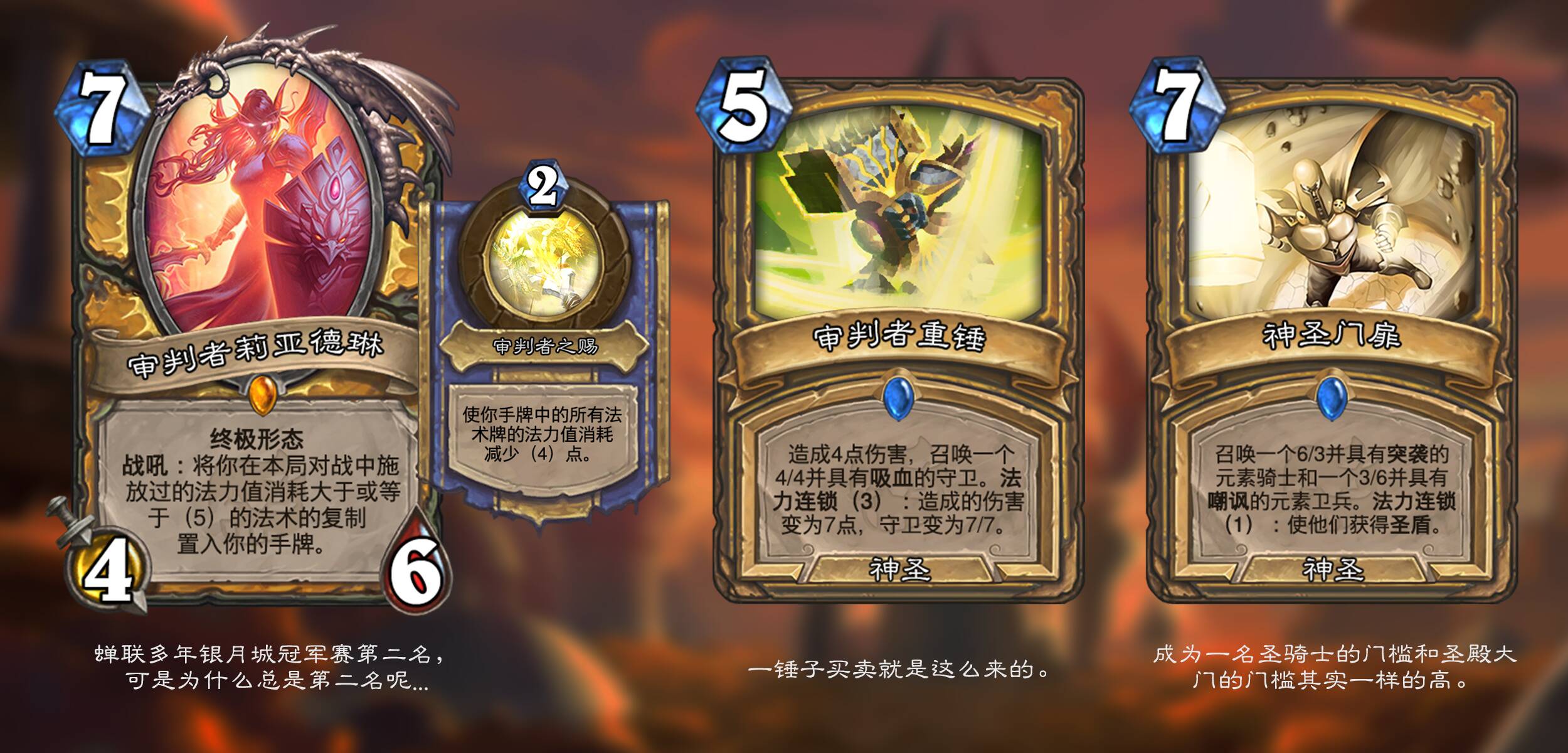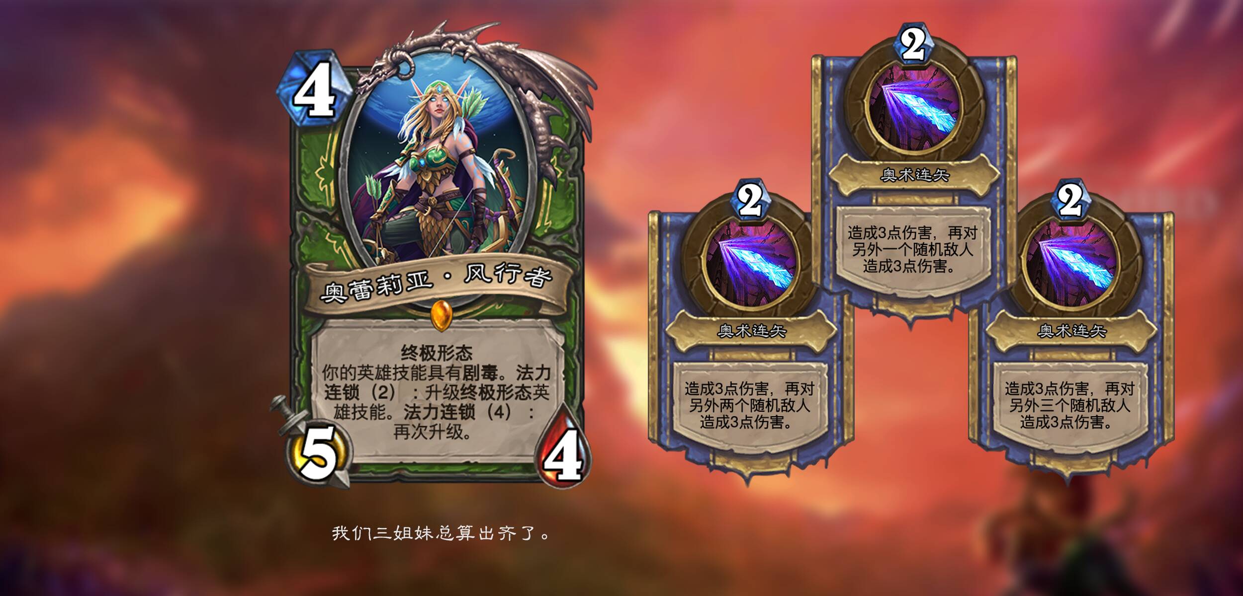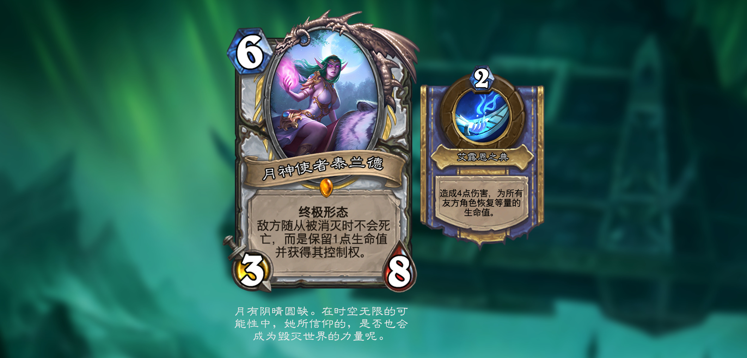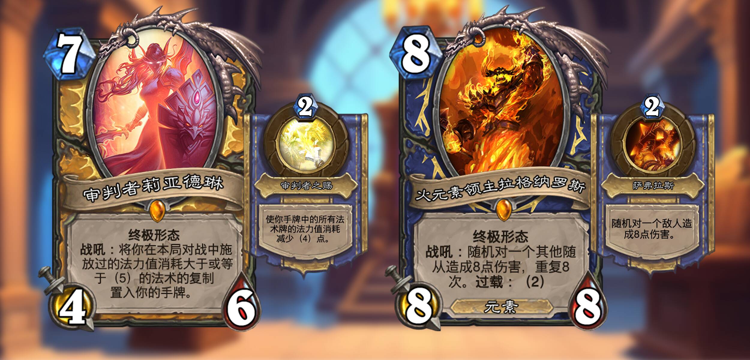 艾泽拉斯的各个英雄在时间线上找回了自己巅峰时期的力量。具有终极形态关键词的随从在场时会用其独有的英雄技能替换你的英雄技能,并且终极形态的技能在其退场仍可以再使用一次!这份力量独属于传说随从,每个职业及中立各一张。