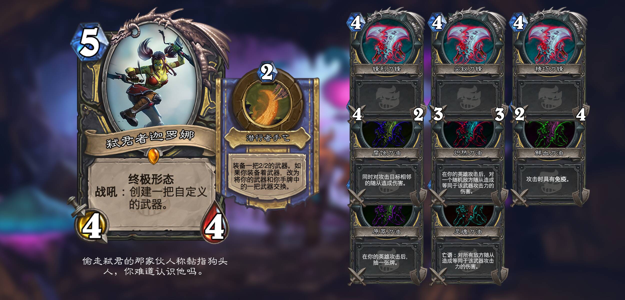 *弑君者迦罗娜:自定义规则为选择刀的身材(刀固定为4费),然后从所有其他效果中选择两项;终极形态技能在手中没有武器时不会触发交换。
