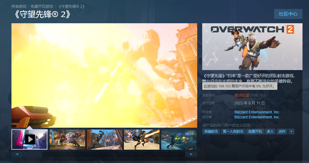 《守望先锋2》目前已在Steam平台正式发售,随着游戏的发售,有关该作的负面评价越来越多,截止发稿时,游戏好评率跌破10%,只有9%。