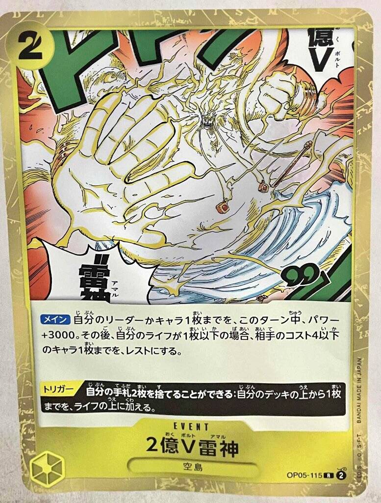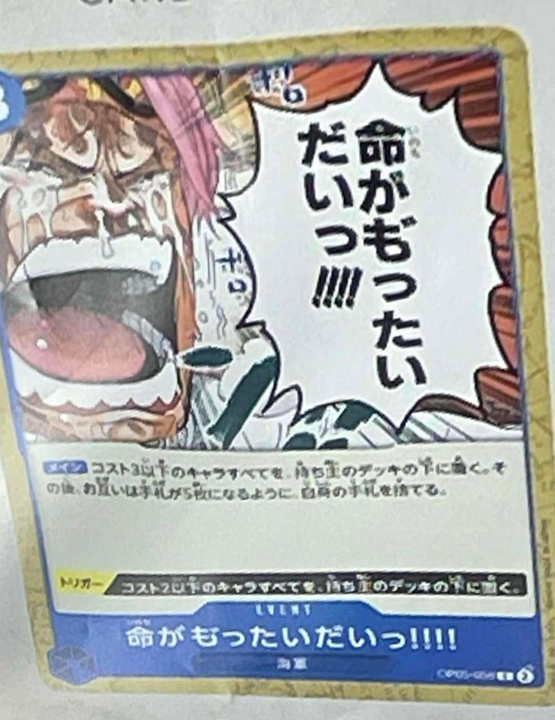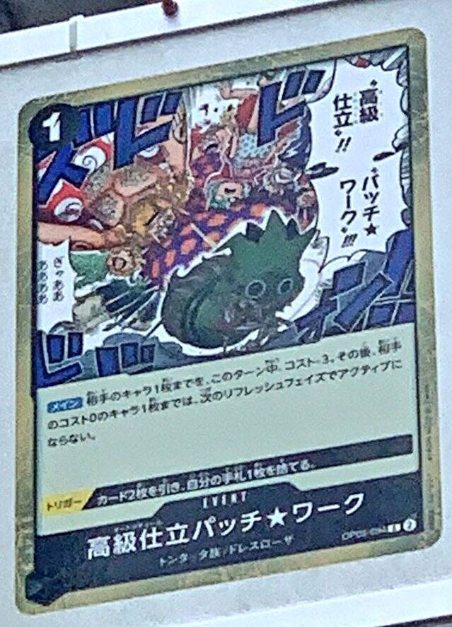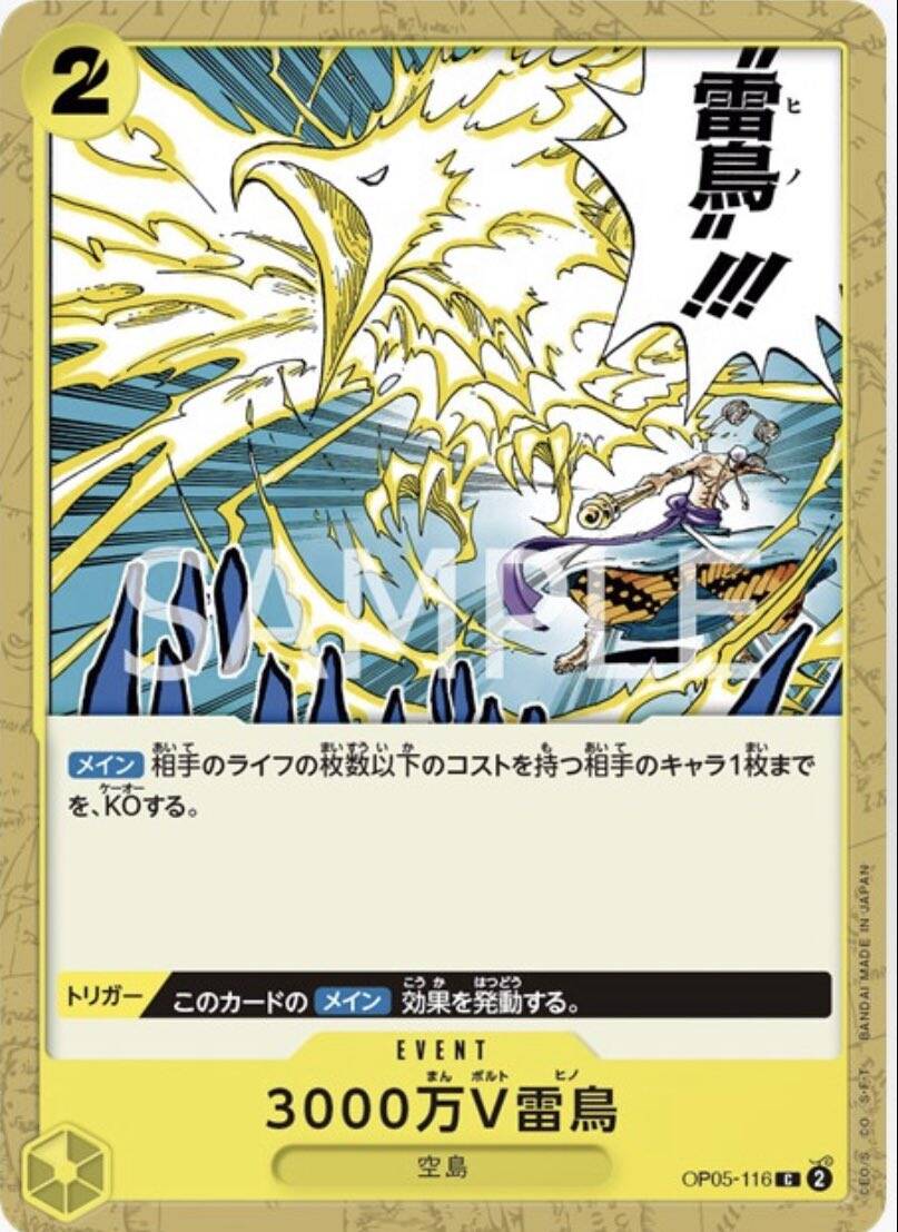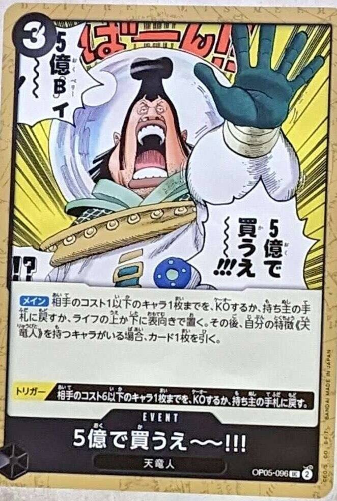 主要:KO对手一个1费以下角色,或将其返回手牌,或将其正面朝上置入血区顶端或底端。然后,如果场上拥有带有[天龙人]特征的角色时,抽一张牌。