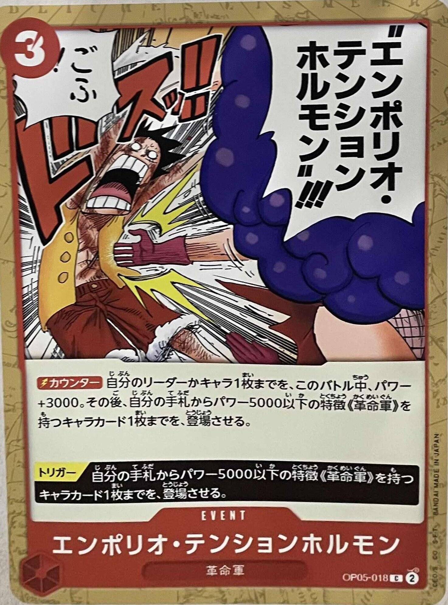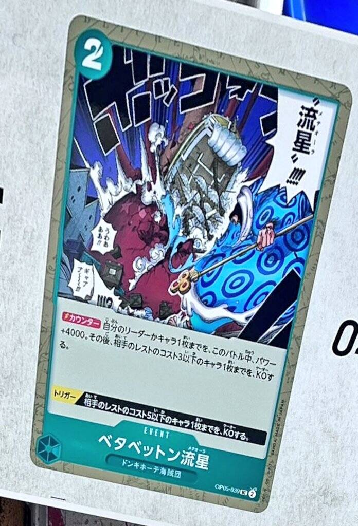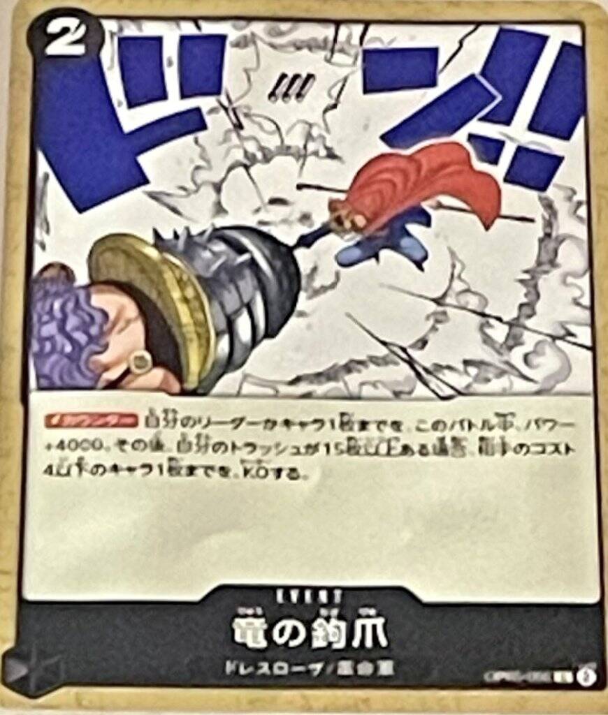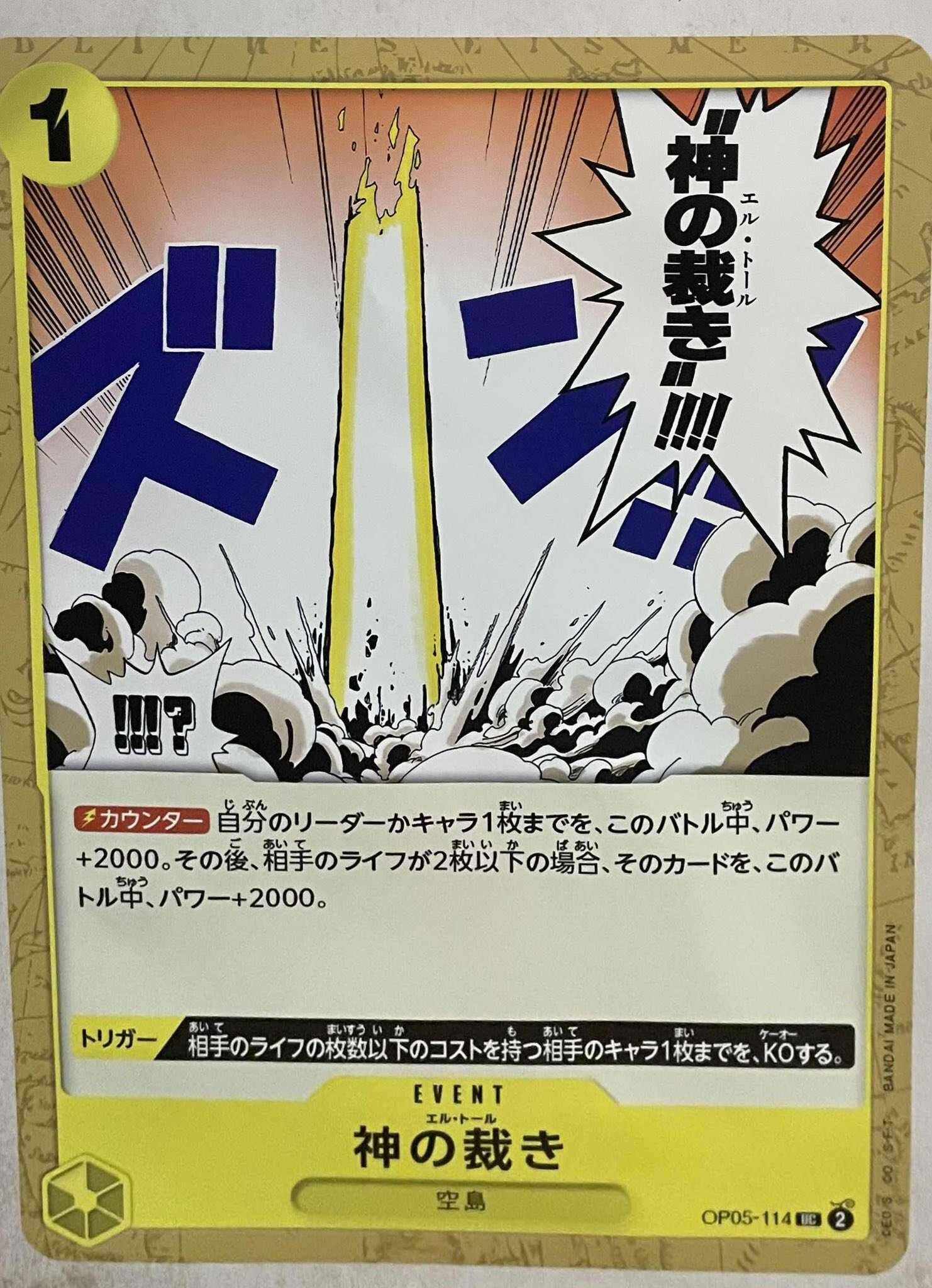 主要:KO对手一个1费以下角色,或将其返回手牌,或将其正面朝上置入血区顶端或底端。然后,如果场上拥有带有[天龙人]特征的角色时,抽一张牌。