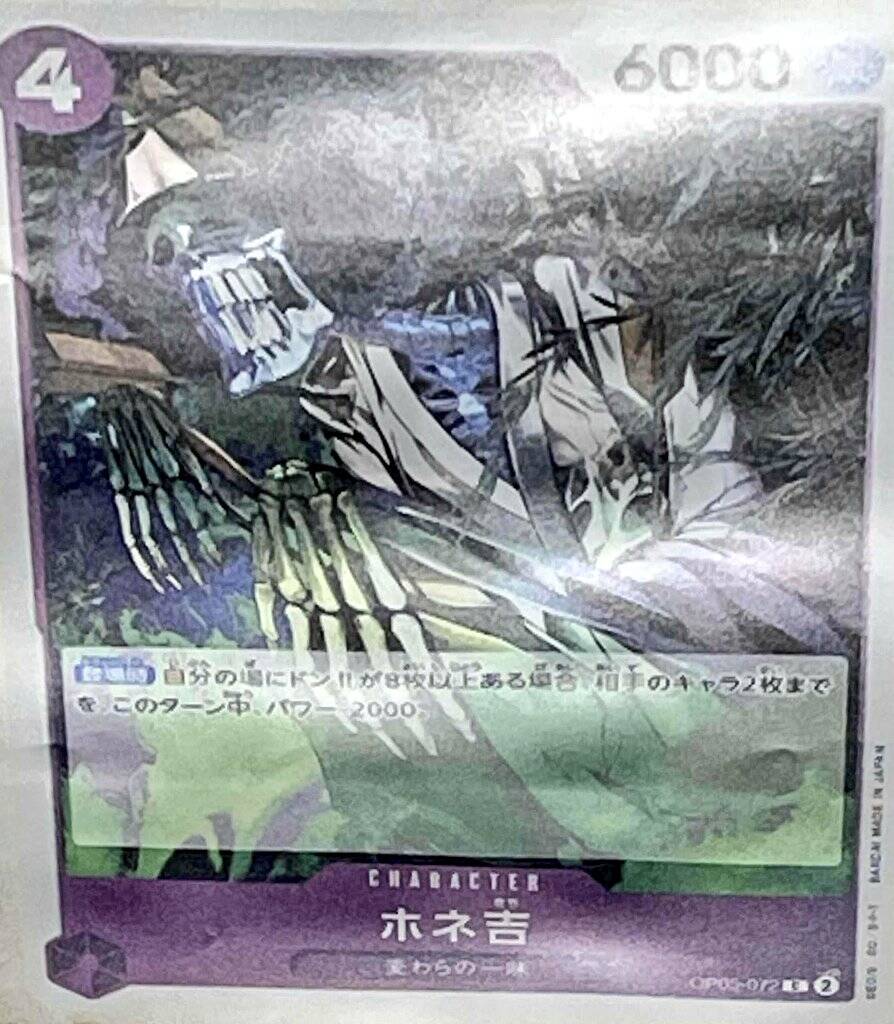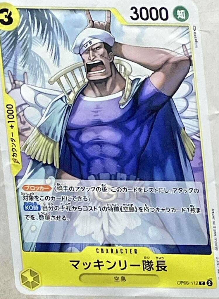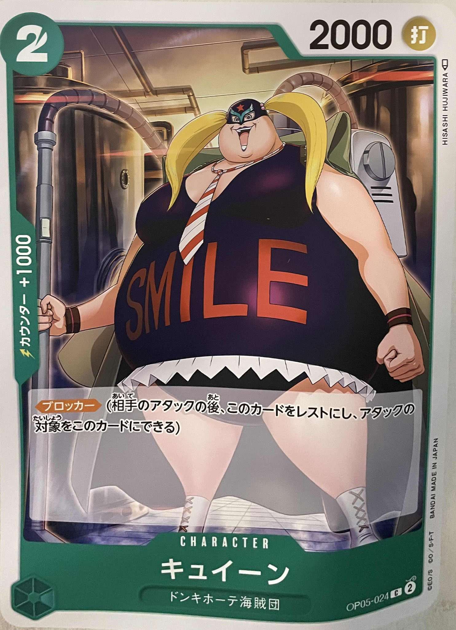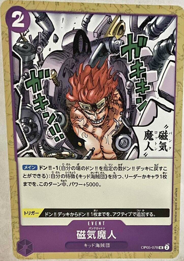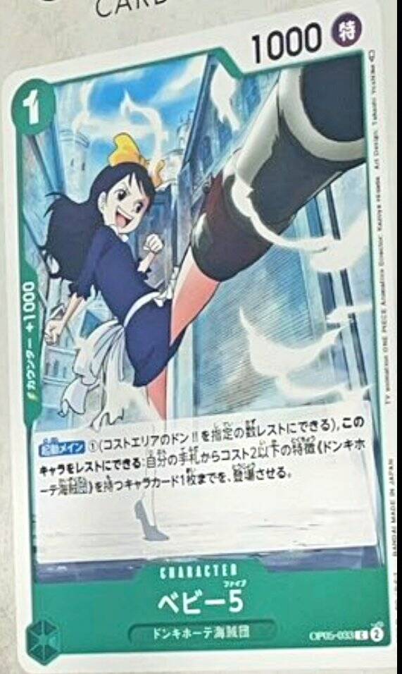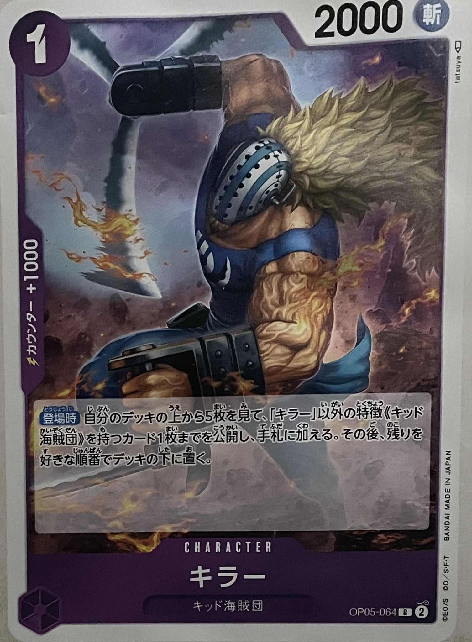 登场时:确认牌库顶5张牌,选择1张[基拉]以外的,带有[基德海贼团]特征的卡加入手牌,其余以任意顺序置入牌库底。