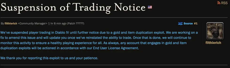 由于金币和物品复制漏洞,我们暂停了《暗黑破坏神 IV》的玩家间交易系统。我们正在努力解决这个漏洞,一旦恢复了交易系统,我们将立即通知玩家。完成修复后,我们将持续监测交易活动,以确保所有人都有健康的游戏体验。一如既往,任何参与金币和物品复制的账户都将根据我们的最终用户许可协议进行处理。