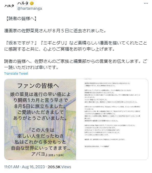今日(8月16日),漫画杂志《ハルタ》官方推特发文表示热门漫画《在下坂本,有何贵干?》漫画家佐野菜見于8月5日因癌症去世,年仅36岁。