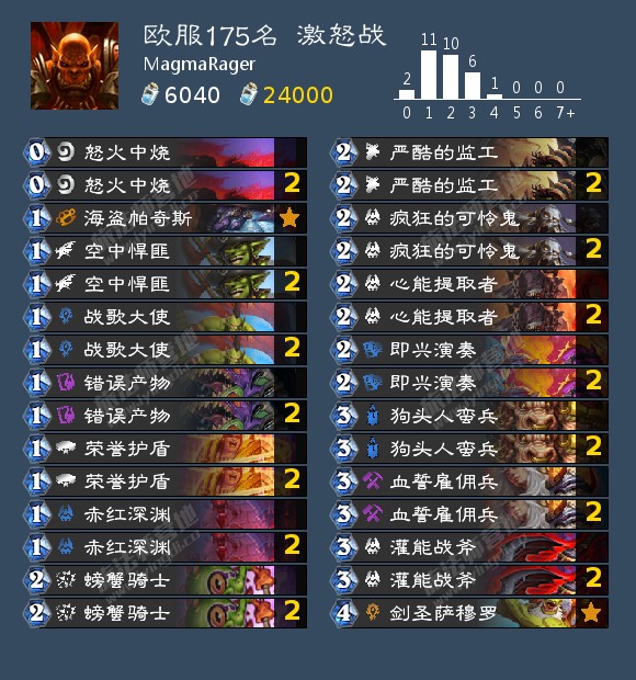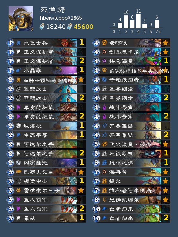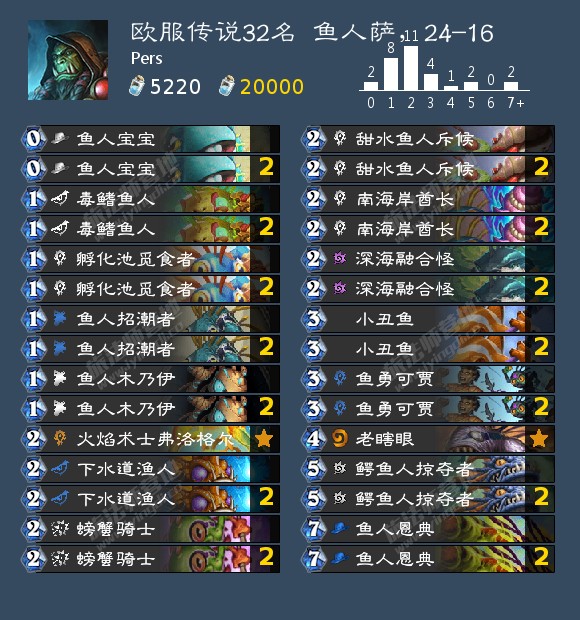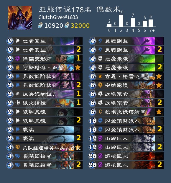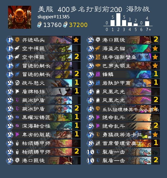 本人id是slupper#11385,投稿一套30海防战,美服400名开打,8-1进月榜,中间一波5连胜,不过这是最终版本构筑的战绩,之前调试过程打了略有十局,一直在400名踏步,所以战绩大约是13-6。乐队经理精英牛头人酋长里是 盗版之王托尼 游荡恶鬼 奈利,超巨蛇颈龙。除了奇迹德 开门法大劣以外,大部分对局都是均势到优势