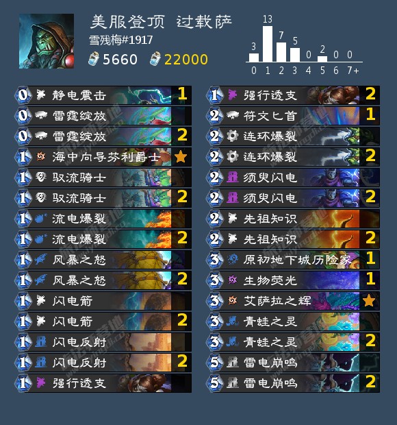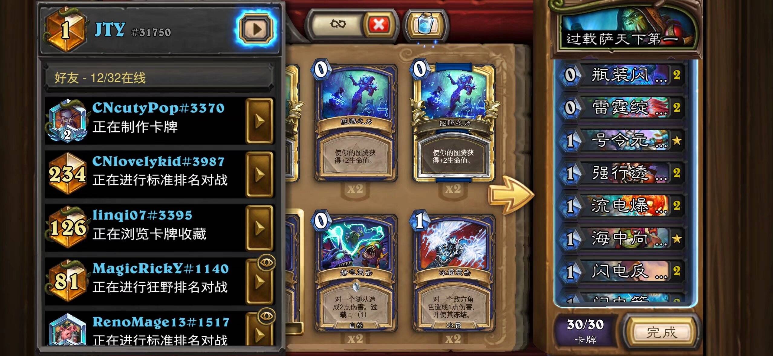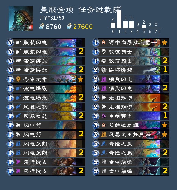 带任务对过载解锁要求比较严谨,新手还是不建议带任务。卡组也不是很虚快攻,因为小解和AOE 比较多,还有比较重要的1费驭流骑士发现牌,除非能够斩杀对面,前期最好找过牌和雷霆绽放或者瓶装闪电,配合3费青蛙之灵能过手牌,有海中向导芬利爵士和风暴之王托里姆,正常卡手几率不是太大,要是卡法术了,那就可以做完任务拍风暴召唤者布鲁坎,正常建议风暴召唤者布鲁坎没场面别做出来,比较怕卑劣的脏鼠,吞噬者穆坦努斯。6费做出风暴召唤者布鲁坎直接拍上,马上可以打出超高斩杀,流电爆裂这张牌我建议前期不要下光,解对面怪可以交闪电箭和闪电风暴,不要担心对面肉斩杀限不够,流电爆裂和生物荧光配合法强可以打出超高爆发,还有解锁的伤害最后打出,基本60血以下轻松秒。要是手里纯卡过载法术了,就想办法下风暴召唤者布鲁坎,很多玩家会觉得法术带的多会卡手,其实做任务差不多是要这么多过载的。