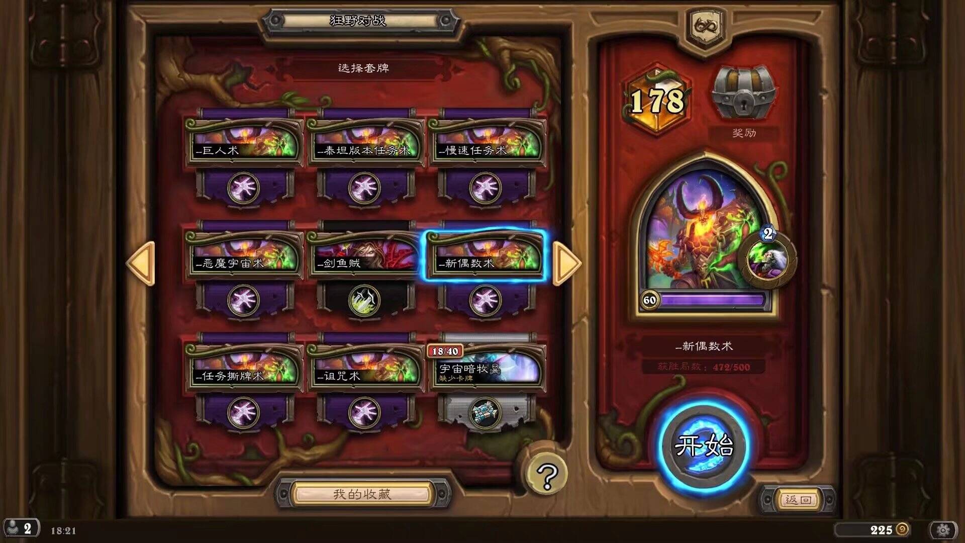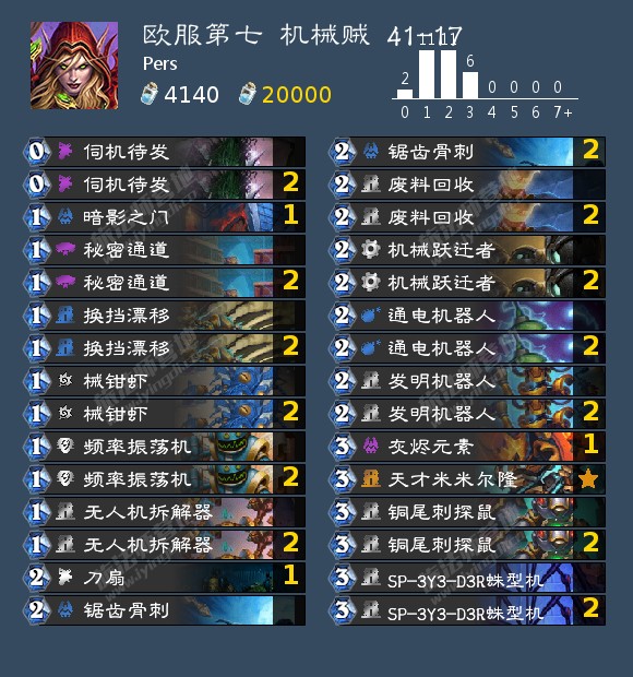 今日的卡组有: 奥秘猎,奥秘法,开门法,死鱼骑,机械贼,任务贼, 剽窃贼,过载萨,任务过载萨,鱼人萨,任务术,偶数术,激怒战,海防战