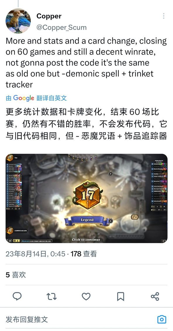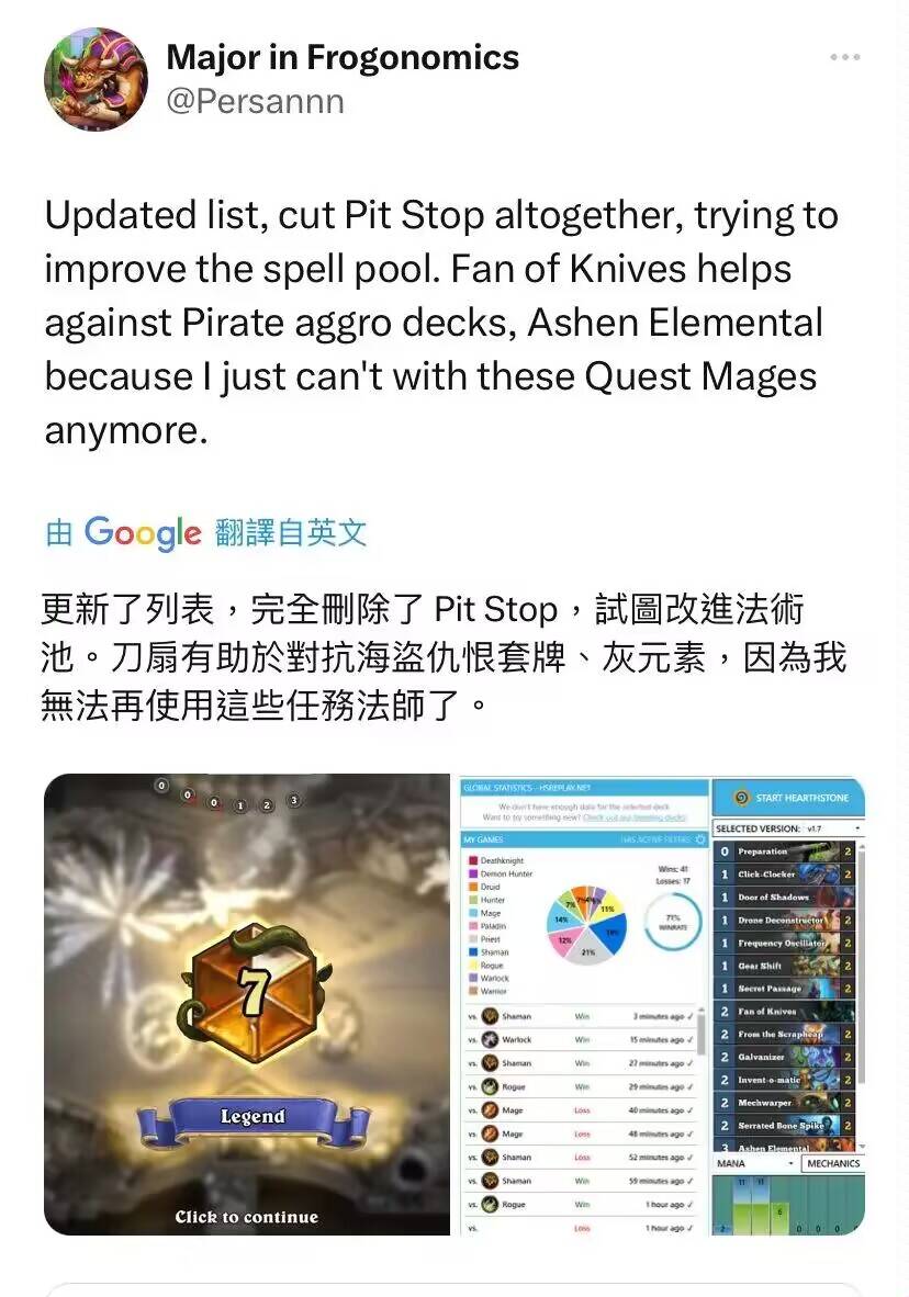 以下以及往后的搬运完全不代表营地炉石卡组日报组所有成员的立场。营地炉石日报组仅仅想純搬运并提供一个汇集与整合卡组资讯的地方来让有兴趣的玩家参考。关于我们提供的卡组,如有任何疑问或想有更多研究,请访问来源链接或询问原卡组作者本人。在炉石社区规模日益缩减的当下,我们邀请大家能抱持着理性讨论的态度交流,一起创造一个更和谐、更包容、更友善的游戏社区。