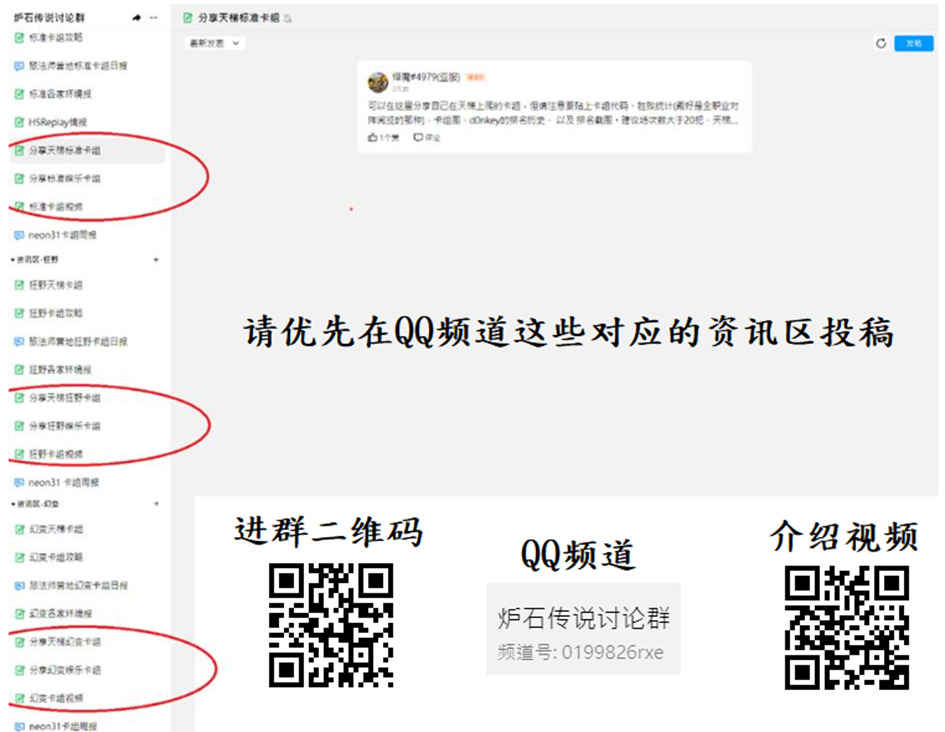 首先欢迎大家进入我们的QQ频道群,这里最重要的一点,能缓解营地日报因为收集到的卡组数不足,而不能成一篇出刊、更新缓慢的问题,也解决了洗版问题、很多人不方便逛推特的问题等。同时也欢迎大家多多在里面发帖投稿你或你看到的卡组(附上来源),通过这样的方式,可让大家在各帖子下面评论,有更多的机会与卡组原作者做交流。