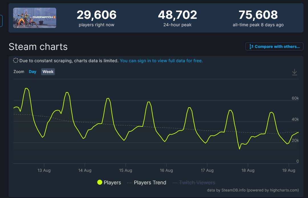 根据 SteamDB 的数据,《守望先锋 2》目前每天的 Steam 玩家峰值约为 50,000 名,发布当天最高峰值为 75,000 名。尽管早期受到了负面评论的猛烈攻击,这款免费游戏仍成为 Steam 本周第七畅销游戏。不过此后它已跌至第 63 位。