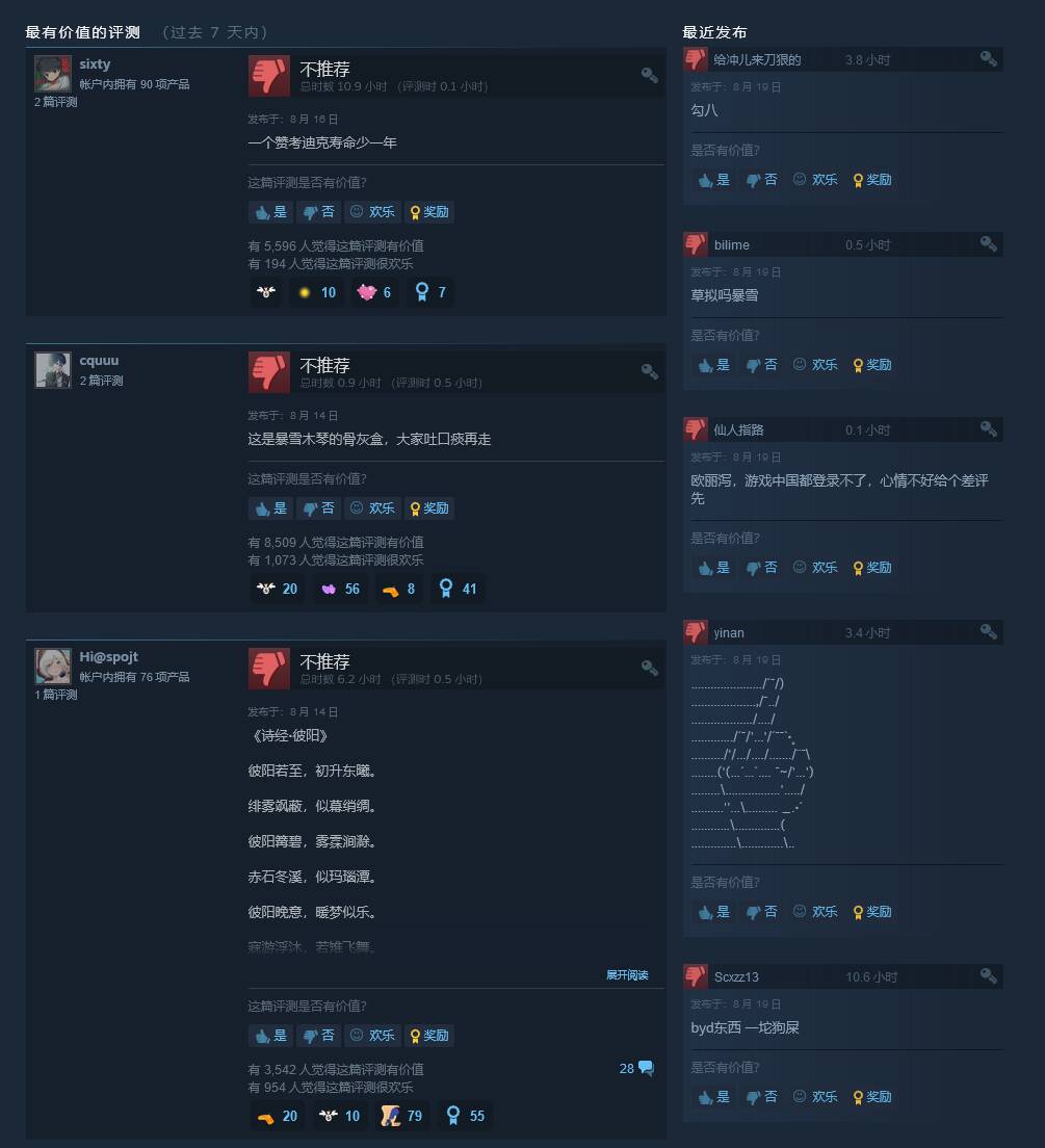 目前,Steam 上已经由超过 14 万条游戏的评价,游戏用户评价政体为“差评如潮”。许多用户给出了合理的批评,也有很多评价只是表情包和 ASCII 图像。