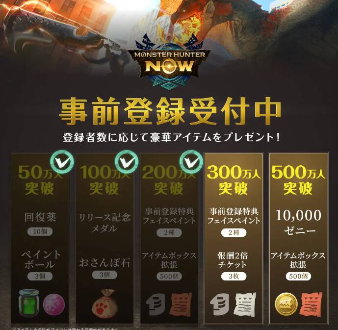 卡普空宣布,旗下预定9月14日上线运营的AR版手机平台游戏《怪物猎人Now》的先行注册玩家突破200万,前三阶段的奖励特典解锁,同时300万突破特典内容解锁公开,敬请期待。