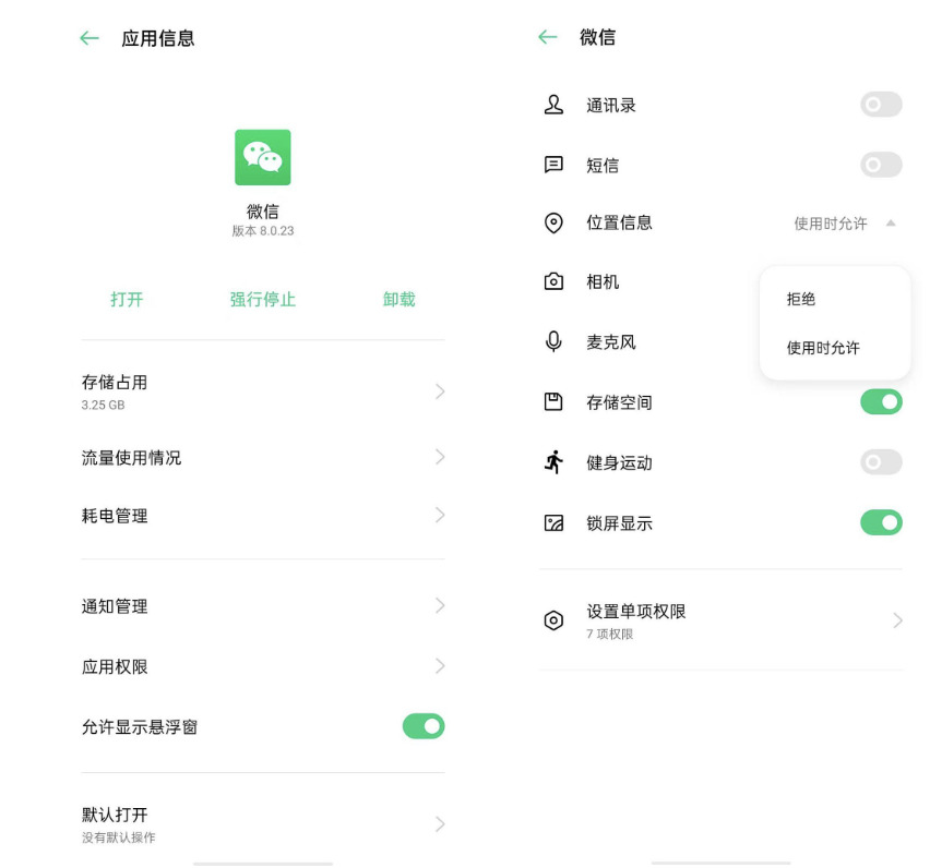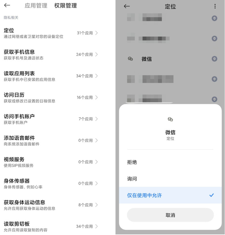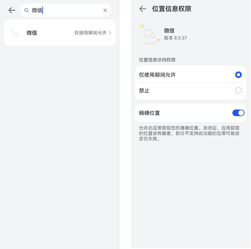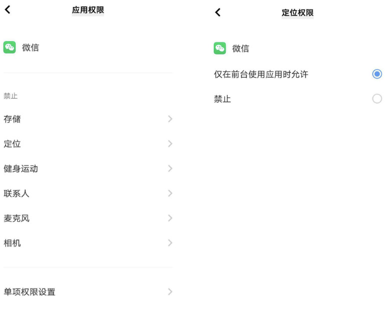 “设置”-“应用与权限”-“应用管理”-“应用程序信息”-“微信”-“权限”-“定位”-“仅在前台使用应用时允许”