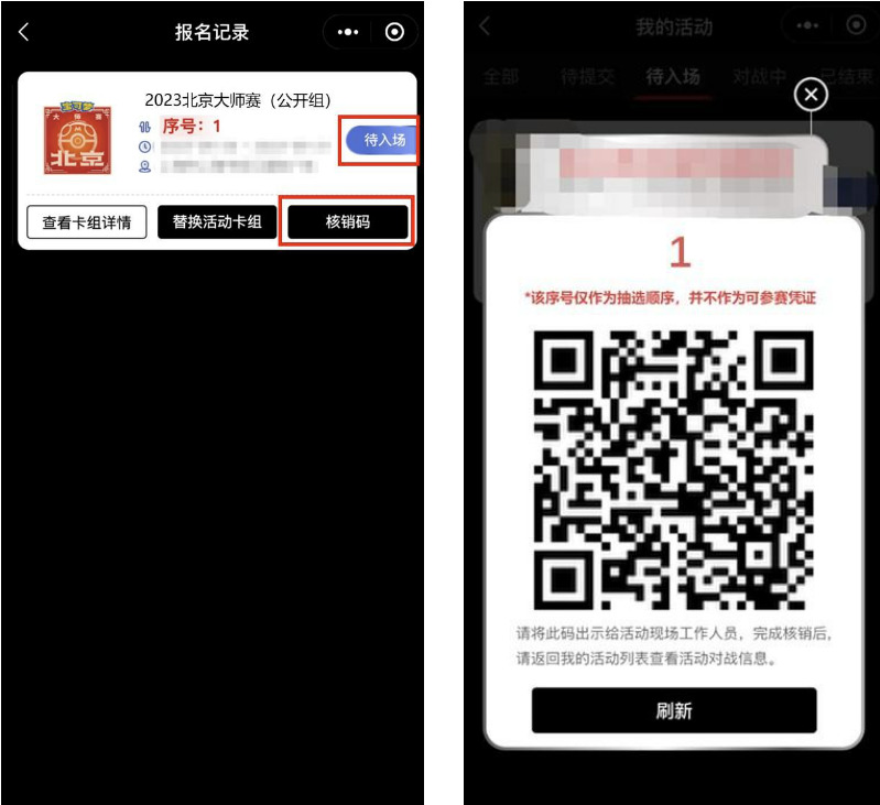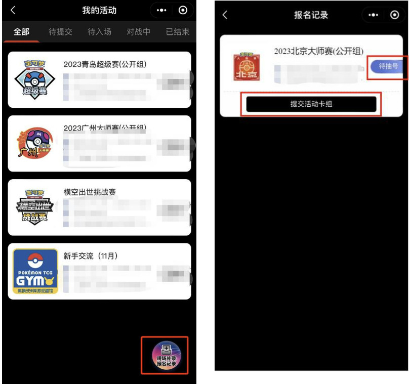 4.完成报名后,可在“我的活动”界面点击“现场补录报名记录”,在报名截止前,活动界面显示“待抽号”,训练家可进行活动卡组提交。
