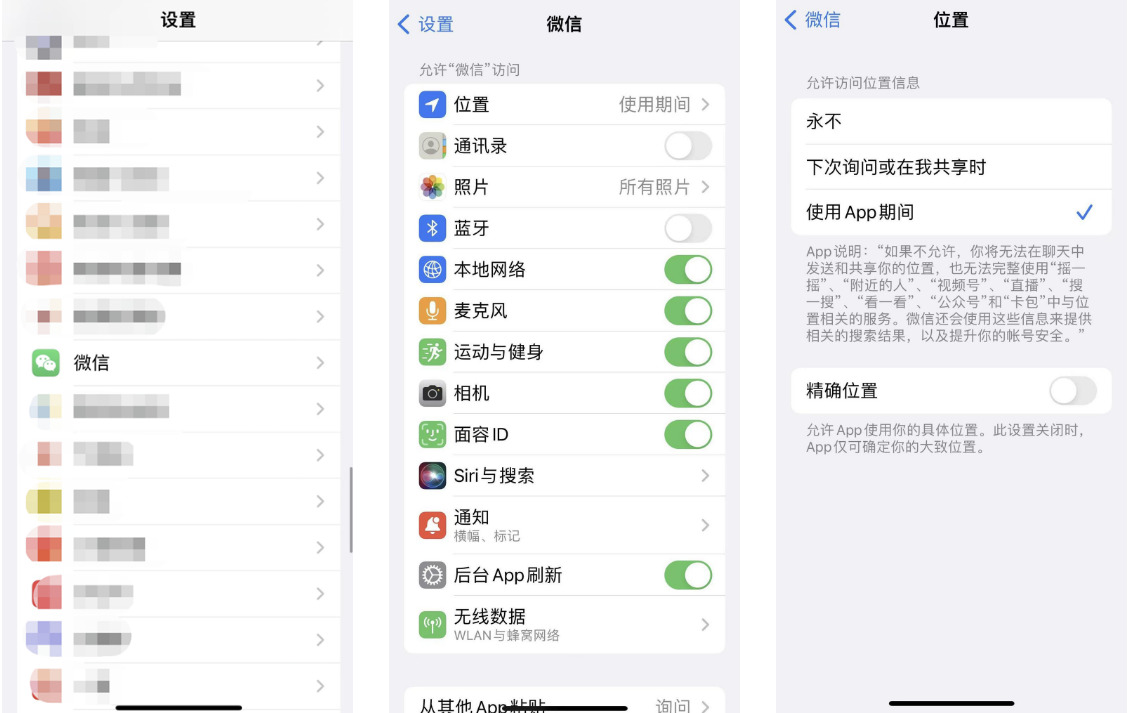 “设置”-“应用管理”-“微信”-“位置信息”-“使用时允许”