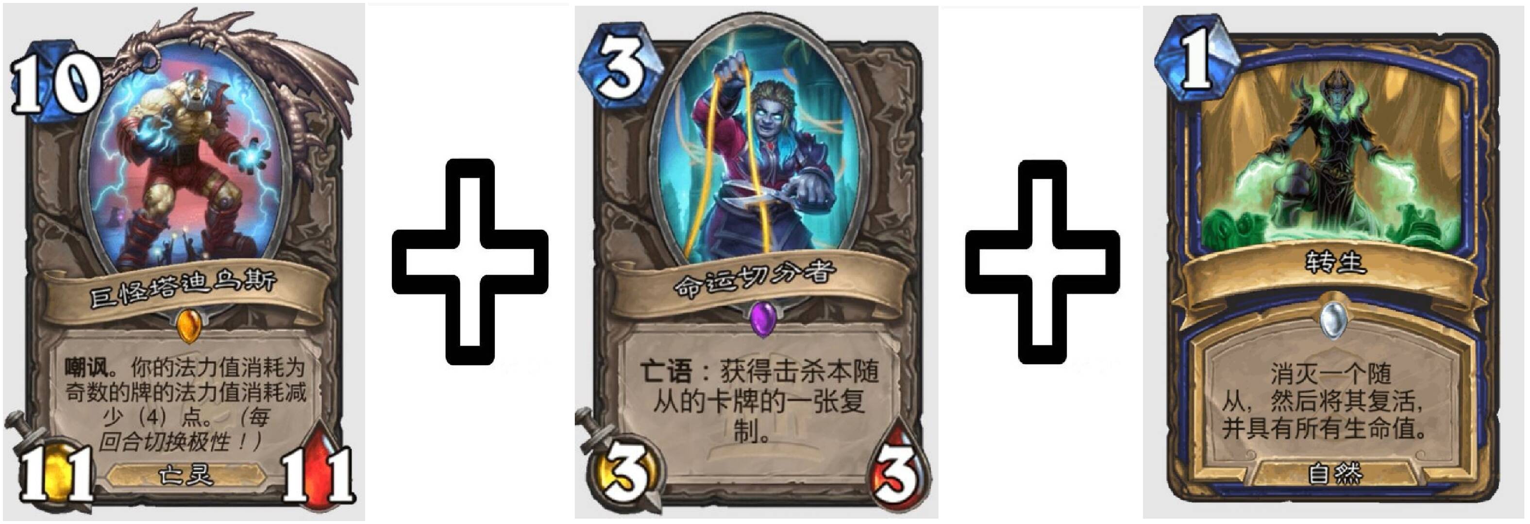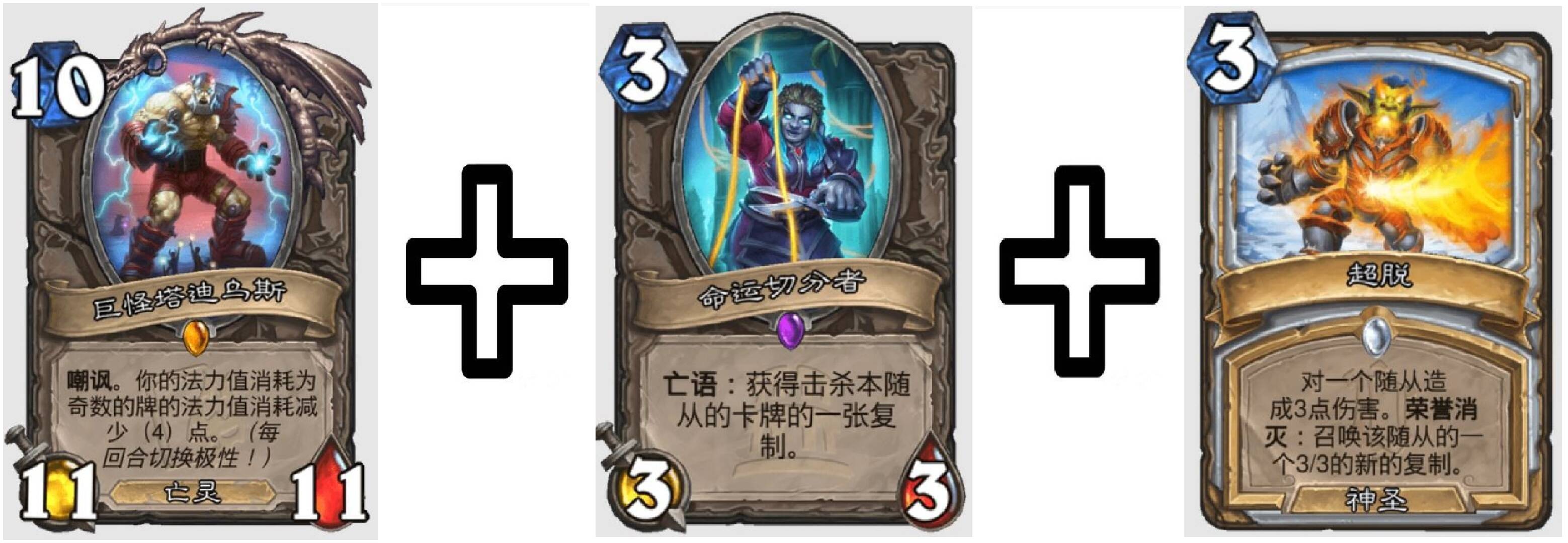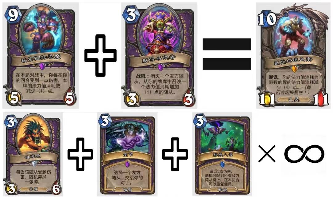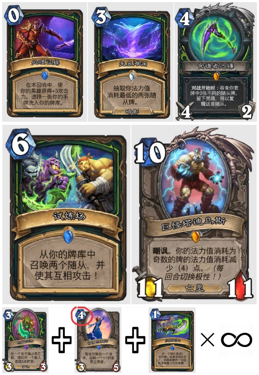 最近好像有不少因为巨怪塔迪乌斯削弱而诞生的娱乐卡组,combo很多,但要实战,必须得解决巨怪提前入场的问题,所以筛选下来,主要还是术士、圣骑士。