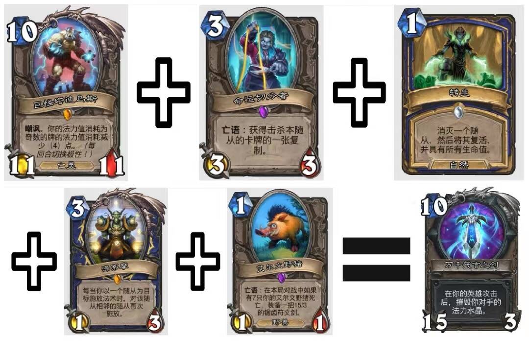 相比圣骑士的特化构筑,术士可以在保留塔迪乌斯小系统的基础上,携带狗头人/亡者复生/火灾等低费优质牌,可以加牛头人,能配合巨人塞布打出剑宗的效果(献祭召唤者吃塞布还能拉军官),还有任务提供回复兜底。