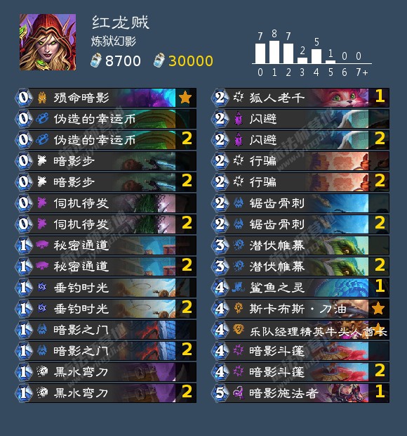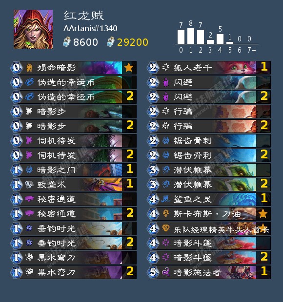 斩杀线的话这个卡组斩杀线很高两回合启动正常伤害有80点足以应对绝大部分对局有骨刺或者暗影步腾格子可以有96点甚至更高,极限伤害有128点,如果害怕打不穿也可以无限红龙。