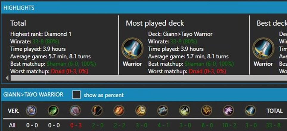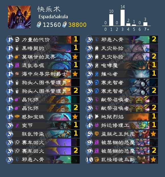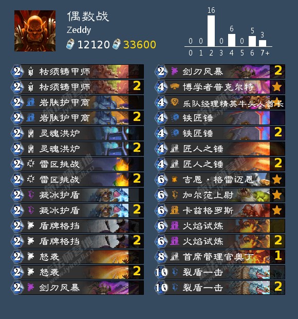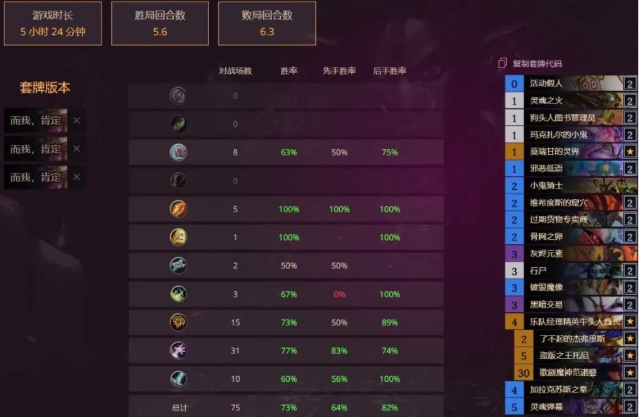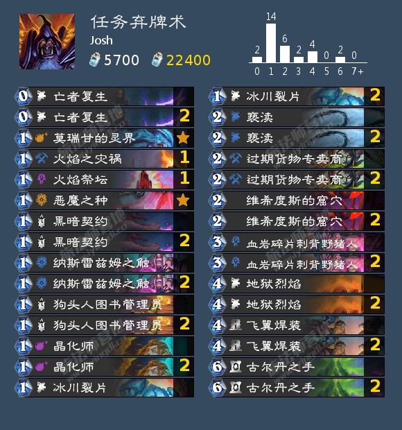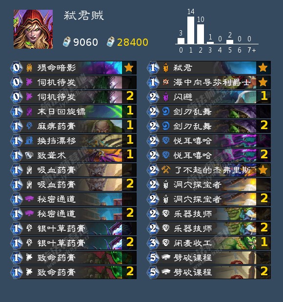 对局的话弃牌术6.5/3.5开其他快攻优势更大,四费不死就基本赢了,对战慢速看脏鼠发挥也不拍战士甲厚80血以下斩杀很轻松,打门和奇迹德只能比胡应该接近55开,倒是比较怕40爆牌德甲厚不出怪无法疼腾格子劣势比较大,不过天梯很少只有一个人是那种构筑其他带随从的不是很怕。
