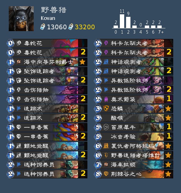 有猎人之魂的卡组,研发中,300到40只输了3把,当前环境可以试一下,不保证上分