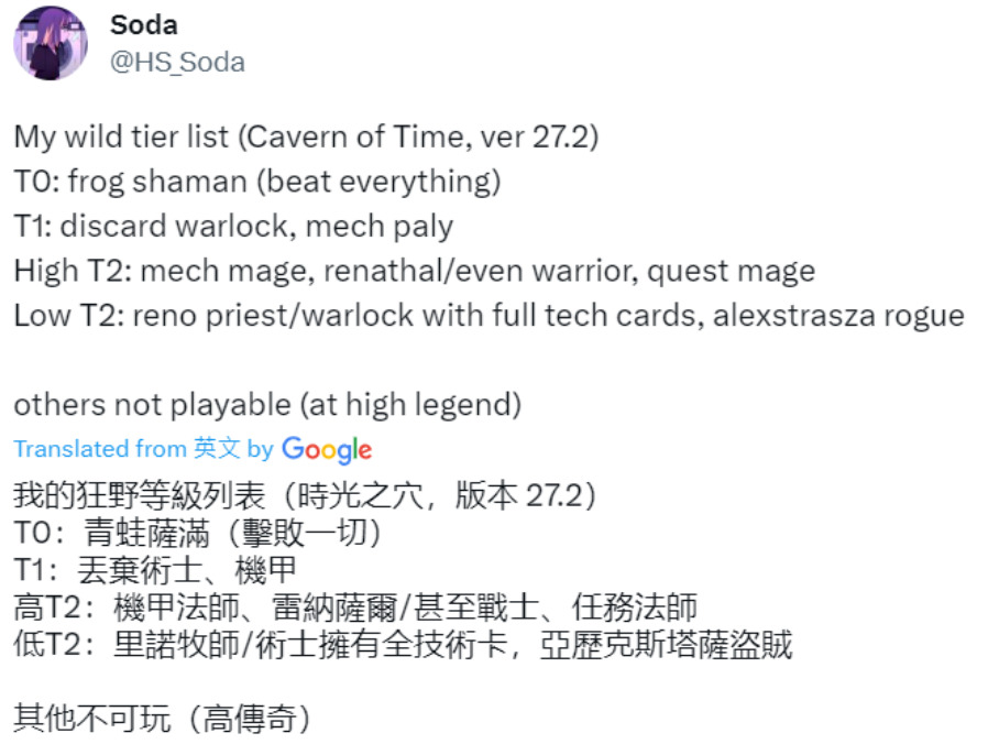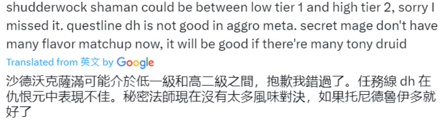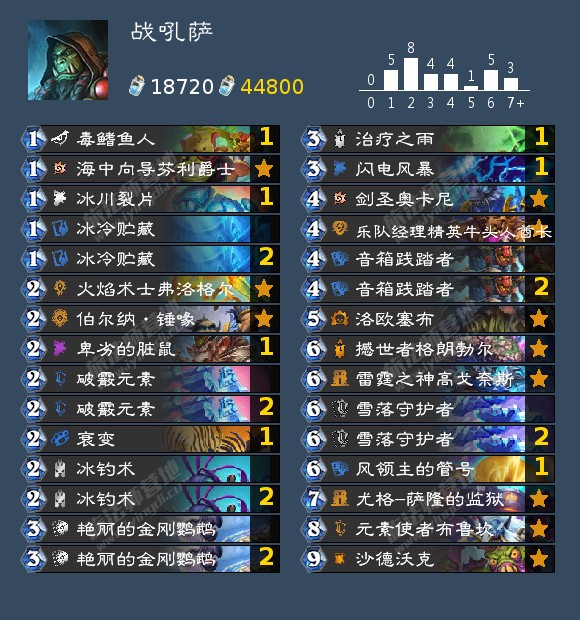战吼萨可以在低T1和高T2,任务瞎在快攻环境并不太好,奥秘法没有太多的优势对局,除非奇迹德很多