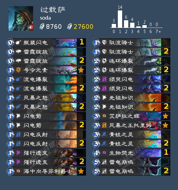 版本真答案过载萨。亚服已登顶,欧服登顶的proyun也玩的过载萨。 (特别感谢迷妹的指点,卡组也是他的) 想要打出上限需要比较高的熟练度,比如控过载、抽牌和启动,也需要对各职业对局有比较多的了解,比如说任务留进度做出来防卑劣的脏鼠。 这里特别讲一个combo,就是先须臾闪电,下回合青蛙之灵启动把牌库里一费抽完(但是别用完),然后海中向导芬利爵士换下去几乎稳定抽到雷霆绽放,再打0费还可以把换下去的一费抽上来,可以实现一回合30斩。因为芬利的动画实在太长了,一定要熟练使用和手速才能打出来,实战中这套我打出来次数也比较少,通常也能打20+,然后下回合连环爆裂斩杀。 任务线是用来打战士(防战偶数战)这种沙包的,宇宙暗牧、战吼萨也能用到,有很高的斩杀。打其他对局,比如弃牌术、内战、纯暗牧、弑君之类的对局起手换任务。 如果你遇到战士不多可以把生物荧光换别的卡。