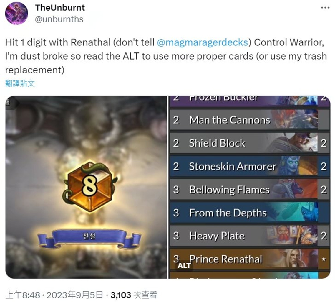 2. 附上卡组图、卡组代码、排名截图、战网id(如果愿意给完整游戏id含#XXXX的尾号,欢迎提供,这样能让更多的人可以加你好友,与你的卡组做交流)、营地id 、区服、来源、直播间、视频链接、精彩游戏的截图等等,也欢迎大家来投稿你在各个地方看到的狂野卡组,不只是自己的。如果卡组有带乐队经理精英牛头人酋长,请特别交代一下你的牛里带什么(因为营地不会显示牛里有啥,请投稿时打上完整的卡名,其他的卡组内文介绍也希望打上完整卡名,方便我们使用营地的卡牌识别)。胜败统计可以提供就尽量提供(最好是附上全职业对阵阅览的那种),没有的话就附上d0nkey驴子网的排名历史 (底线部份是基本要求,必须要提供;其他部份有的话就尽量提供)