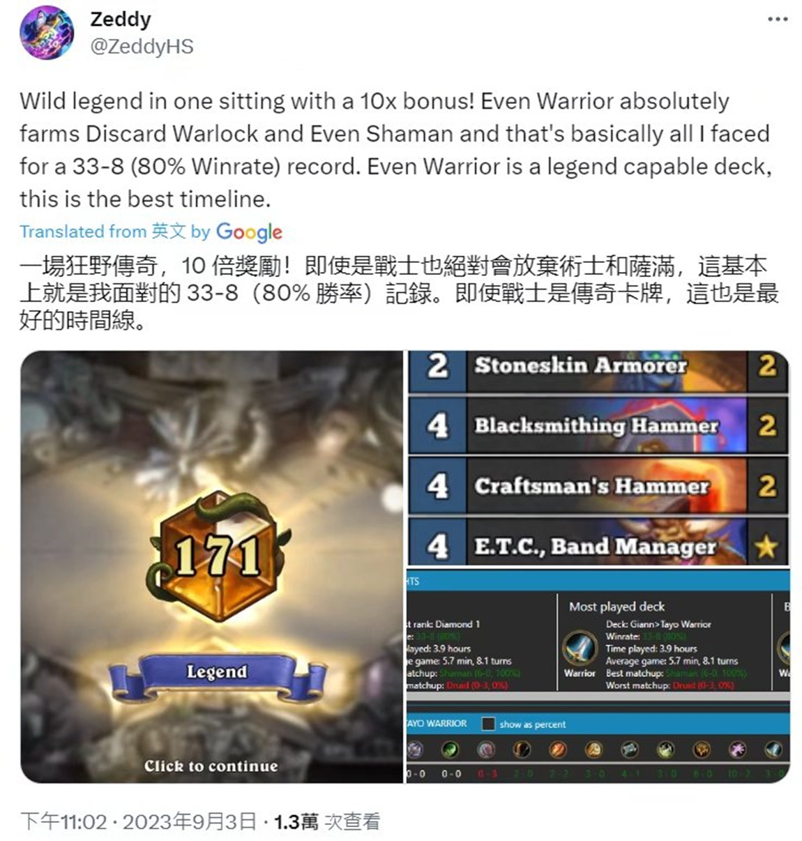 Firestone 内部数据,9月份14名至第2名,构筑比较特别的战吼萨,44-26
