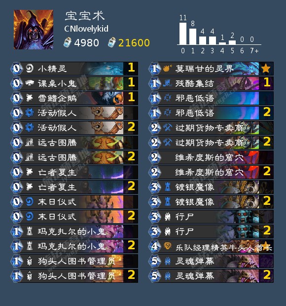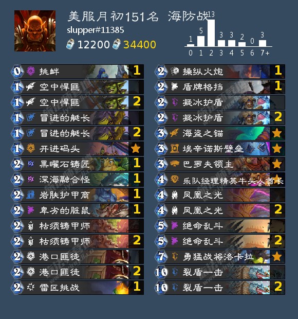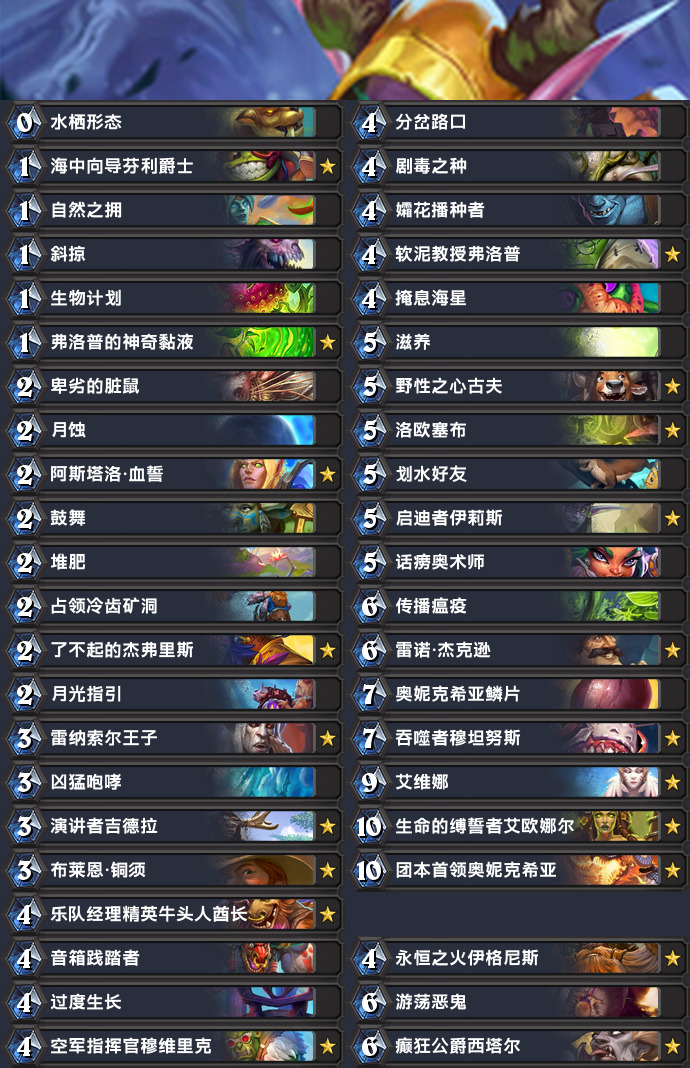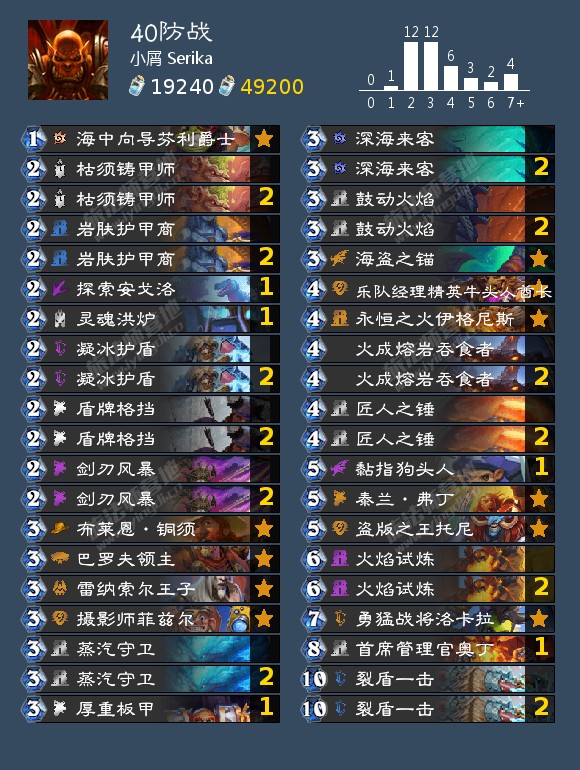 特别讲一下劣势对阵防战,起手留卑劣的脏鼠和伯尔纳·锤喙,如果能拉到首席管理官奥丁基本就赢了,牛的冰川裂片就是为了冻防战的脸,小心10费风怒刀和首席管理官奥丁即可。